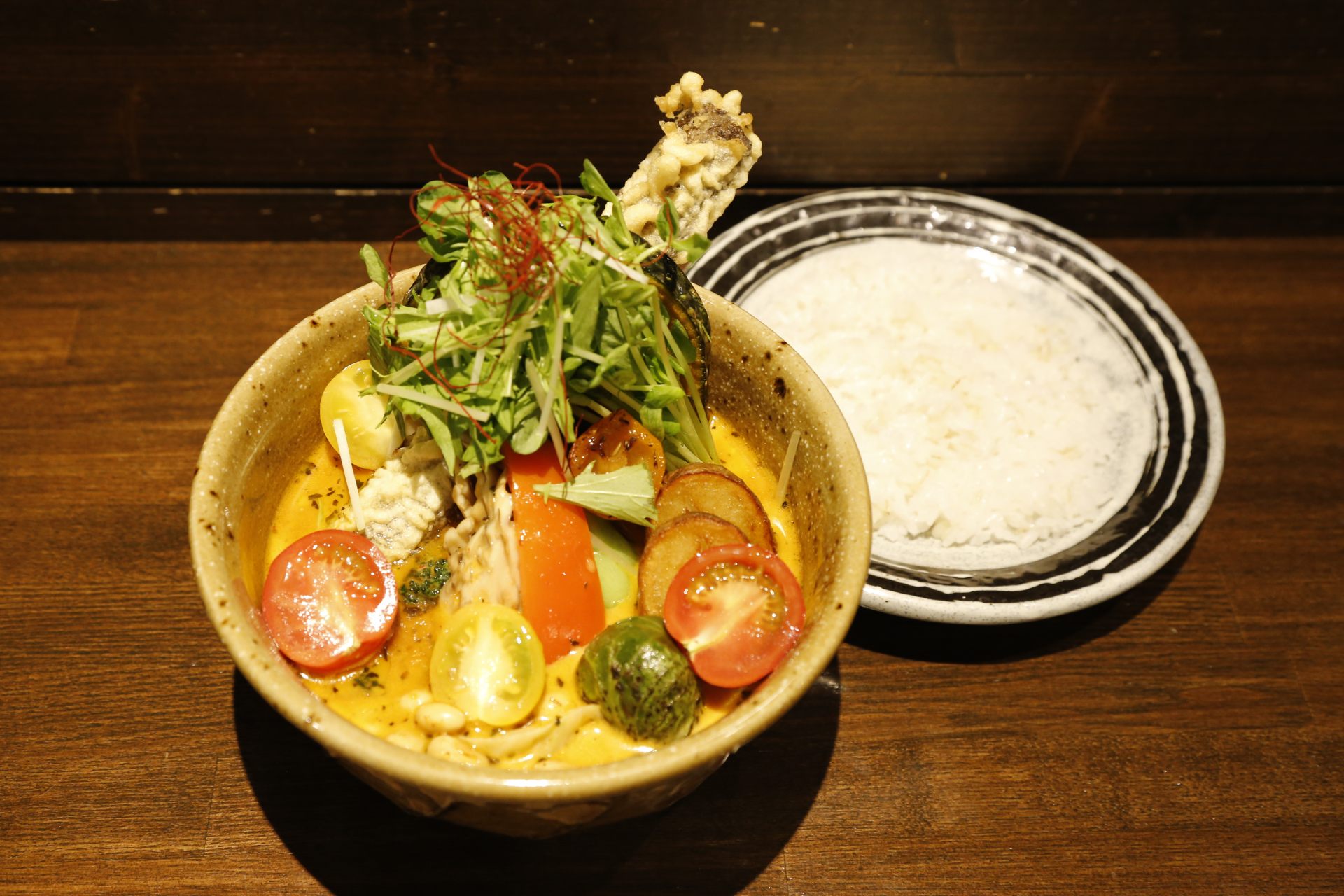 たくさんあるメニューのなかからお店の方におすすめを聞くと「季節の旬菜カリー(1500円)」が人気とのこと。常時15~20種類の旬の野菜がたっぷり入り、それぞれ焼く、蒸すなど調理方法を工夫することで、野菜の味や香り、うま味が最大限引き出されています。野菜の内容は時期によって異なりますが、揚げたゴボウバーがすべてのカレーについてくるのもうれしい。