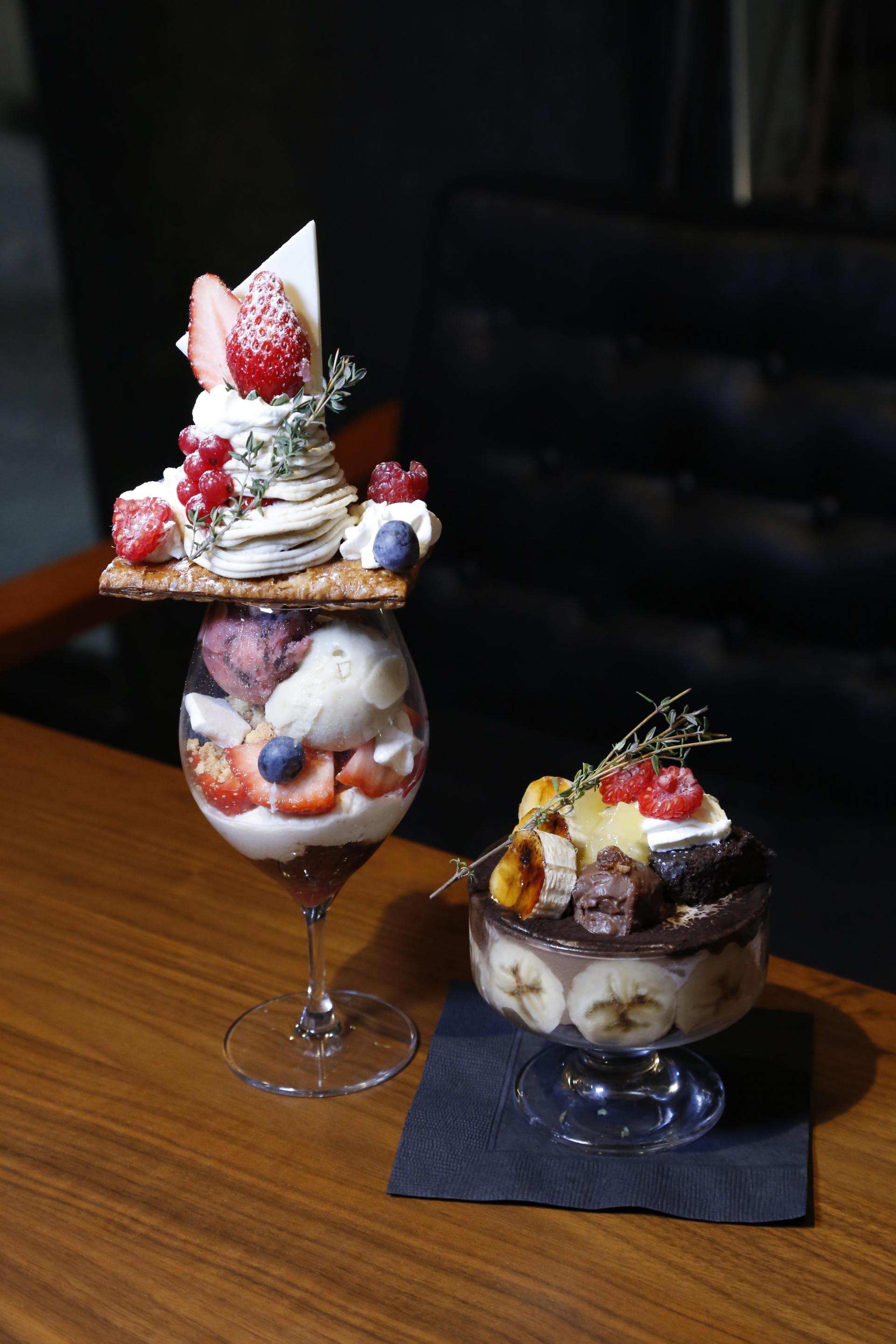 札幌で人気の夜パフェ店「INITIAL Sapporo」は「お酒とデザートのマリアージュ」がコンセプト。まるで芸術品のようなパフェは旬のフルーツを使用し、自家製カクテルやハーブティなども人気です。左は旬のイチゴと和栗のモンブラン、アッサムティーのジュレなどが美しく盛られているパルフェ・フレーズ 2500 円、右はチョコレートをたっぷり使用したショコラ・バナン 1600 円。
