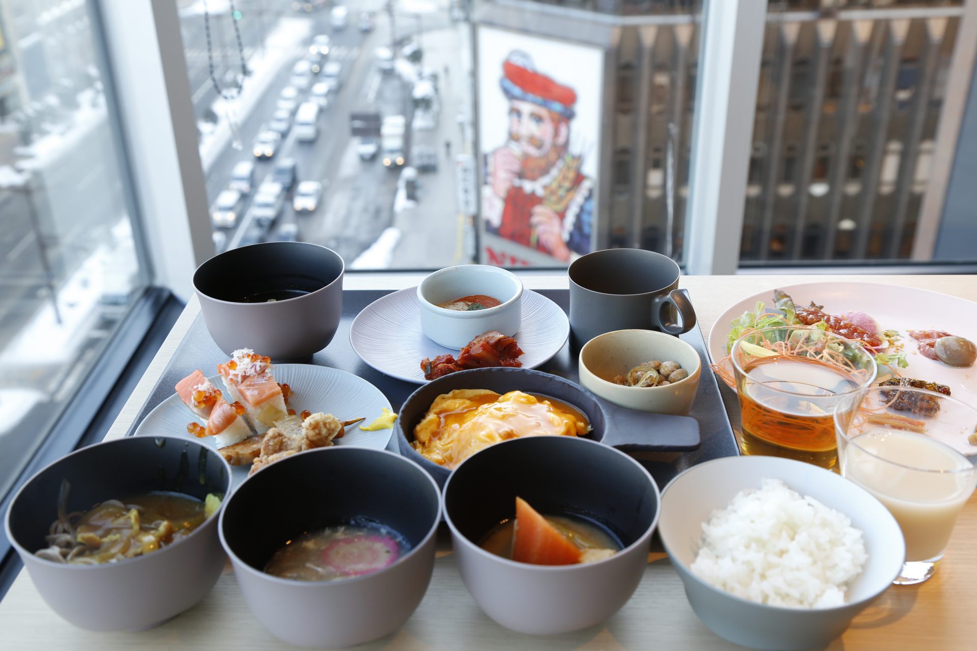 朝食で提供される押し寿司やウニオムライスはその場で作られたできたてを、室蘭やきとりやザンギなど、北海道の名物料理も多数用意され、朝食だけで北海道一周グルメ旅行ができちゃいます! ノルベサの観覧車ノリア側か、ニッカのネオンサインの前の席がおすすめです。