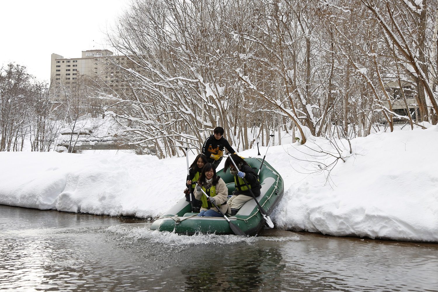 まずは「雪見ラフティング」をご紹介。北海道のラフティングといえばニセコが有名ですが、定山渓もラフティングのスポットとして知られます。複合施設「心の里 埜のてらす」にあり、定山渓をベースに数々の体験を提供している「フリルフスリフ」では、冬季は雪見ラフティングを開催。