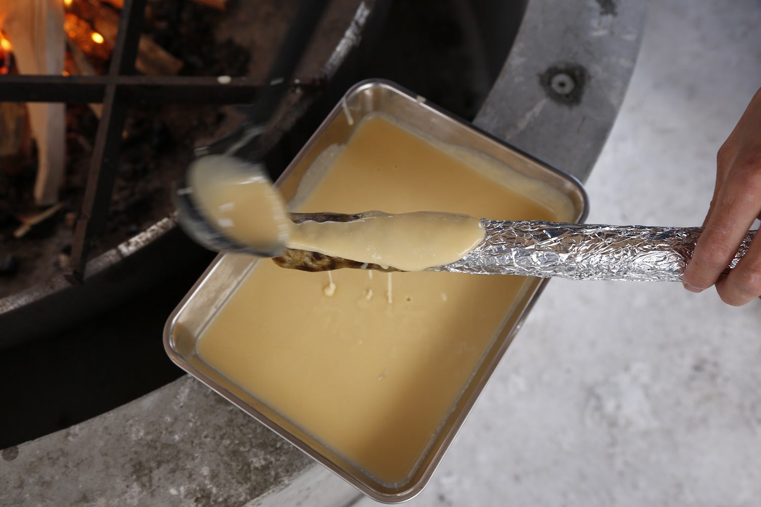 バットに入った特製のバームクーヘン生地を木の棒の先にかけて、焚火の上でくるくるまわします。くるくるまわさないと液ダレするので早くまわし、軽くこがすくらいしっかり焼くのがポイント!