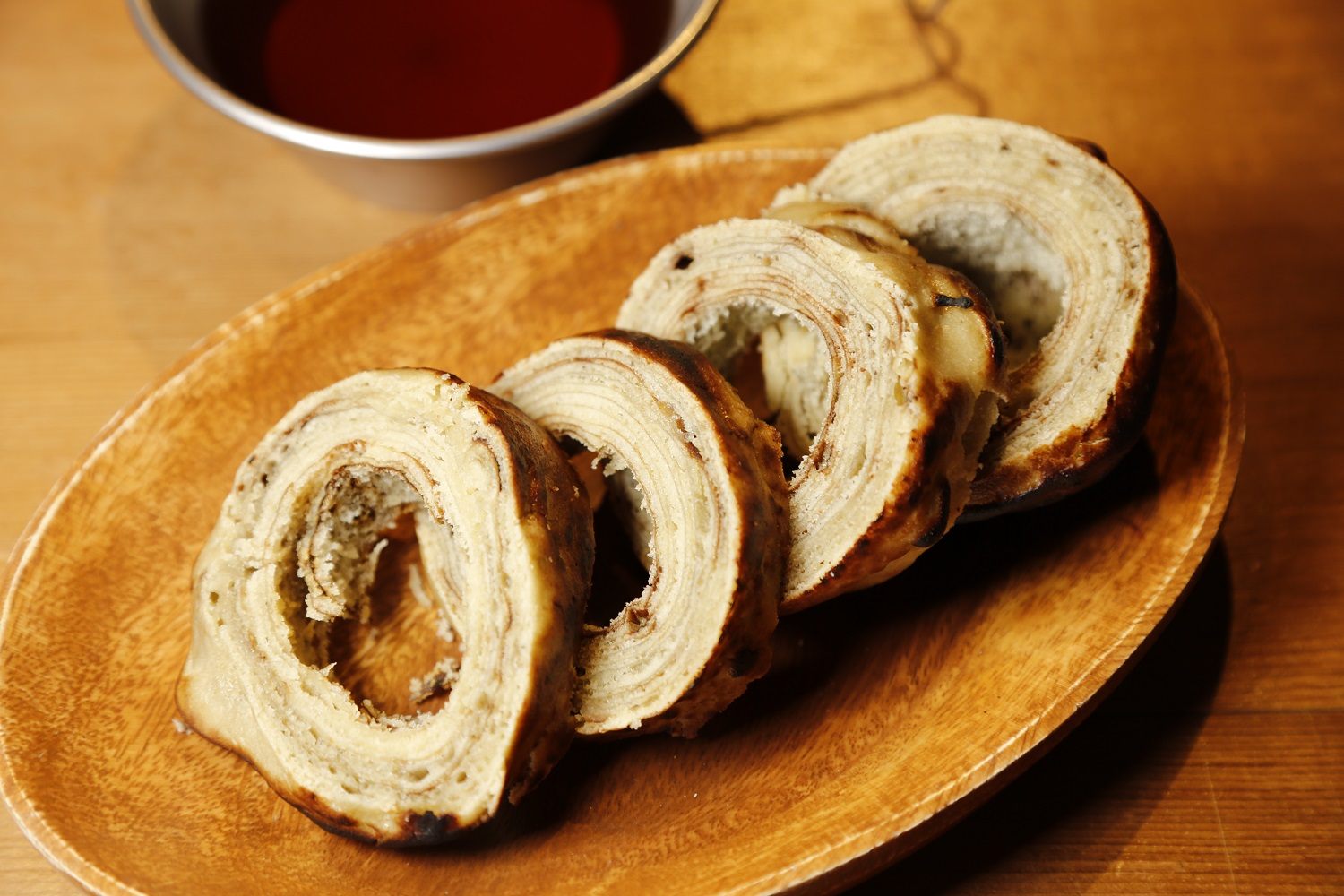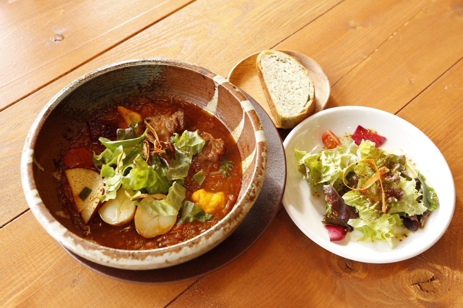 まずは看板メニューという「北海道 埜のシチュー」をオーダー。市内唯一の養豚場の「古川ポーク」を白ワインとトマトベースで煮込み、地元の野菜がたっぷり入った、北の大地の恵みを詰め込んだようなひと皿。シチューはさらさらの口当たりで、スプーンで切れてしまうくらい柔らかいお肉にぴったり。よもぎとくるみを練りこんだ自家製パンといっしょにいただきます。