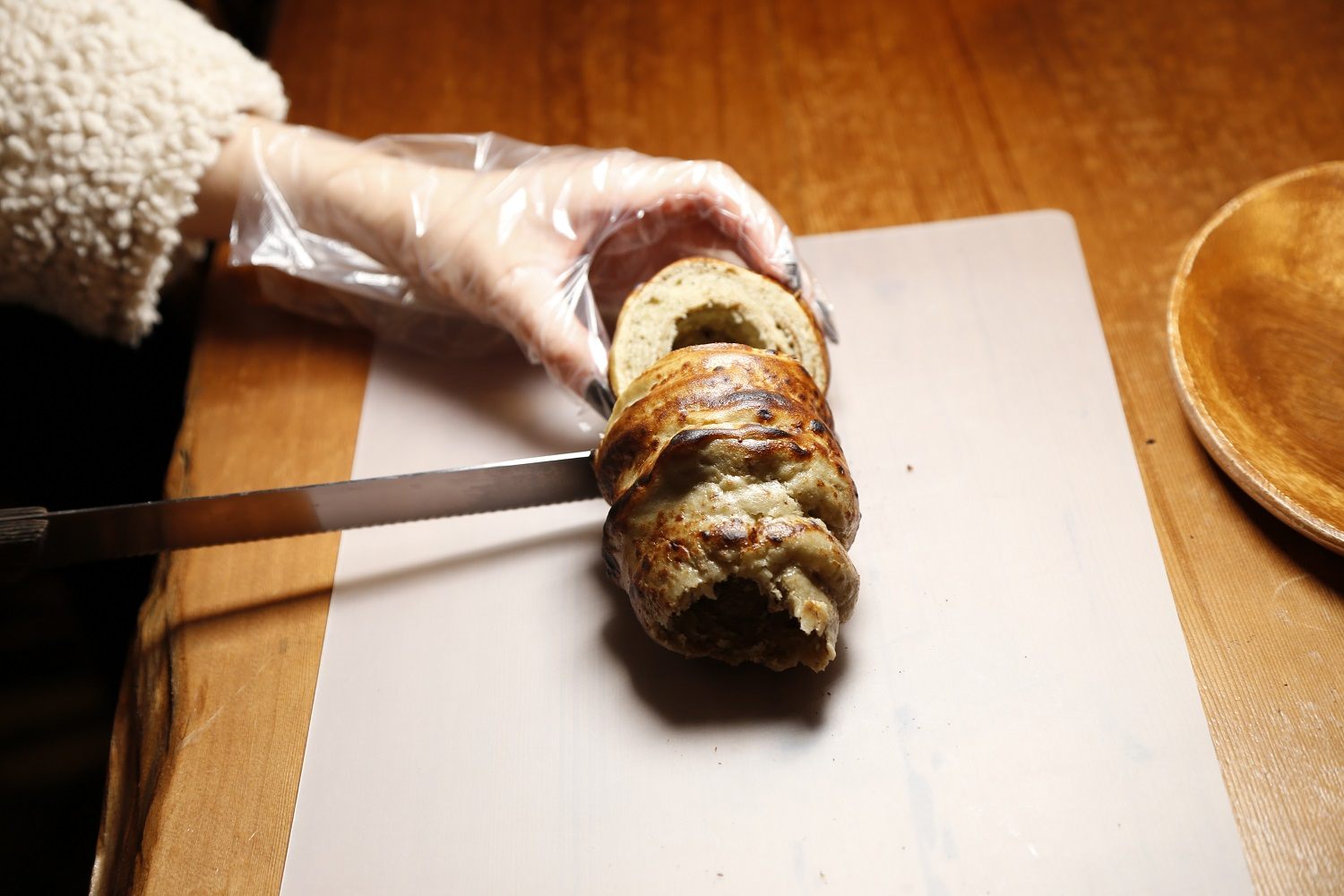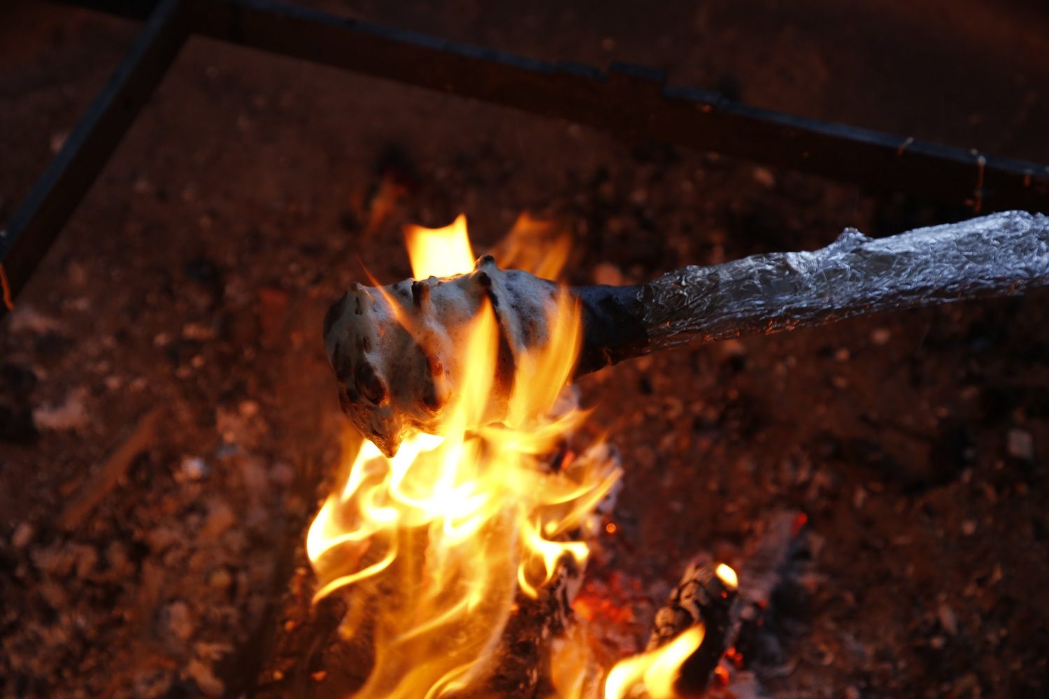 生地をかけて、まわして……を繰り返し、少しずつ生地の層が重なり、年輪を重ね、ほかほかのバウムクーヘンを作り上げます。テントは全天候型、焚火のあたたかさで真冬でも快適でした。回し続けること約 30 分、生地をすべて焼いたところでフィニッシュ。「マンガ肉」のような形になりました。