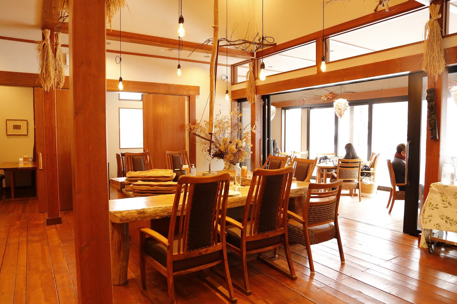 「心の里 埜のてらす」はレストランも完備。訪問したのは大きな窓から定山渓の大自然を望み、店主の好みというビートルズの曲がやさしく流れる「埜ノ山キッチン はるらんな」。無農薬にこだわった野菜や市内の養豚場から仕入れた肉など、新鮮な食材をふんだんに使ったメニューが楽しめます。