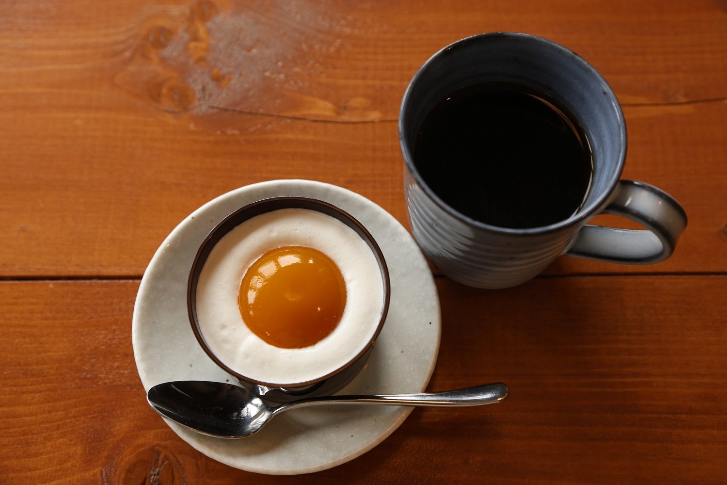 デザートは定山渓たまごプリンを。卵黄に見えるのは実はマンゴーとパッションフルーツのジュレ。ほどよい酸味とやわらかめの生地の甘さが調和した、ここでしか味わえないデザートです。