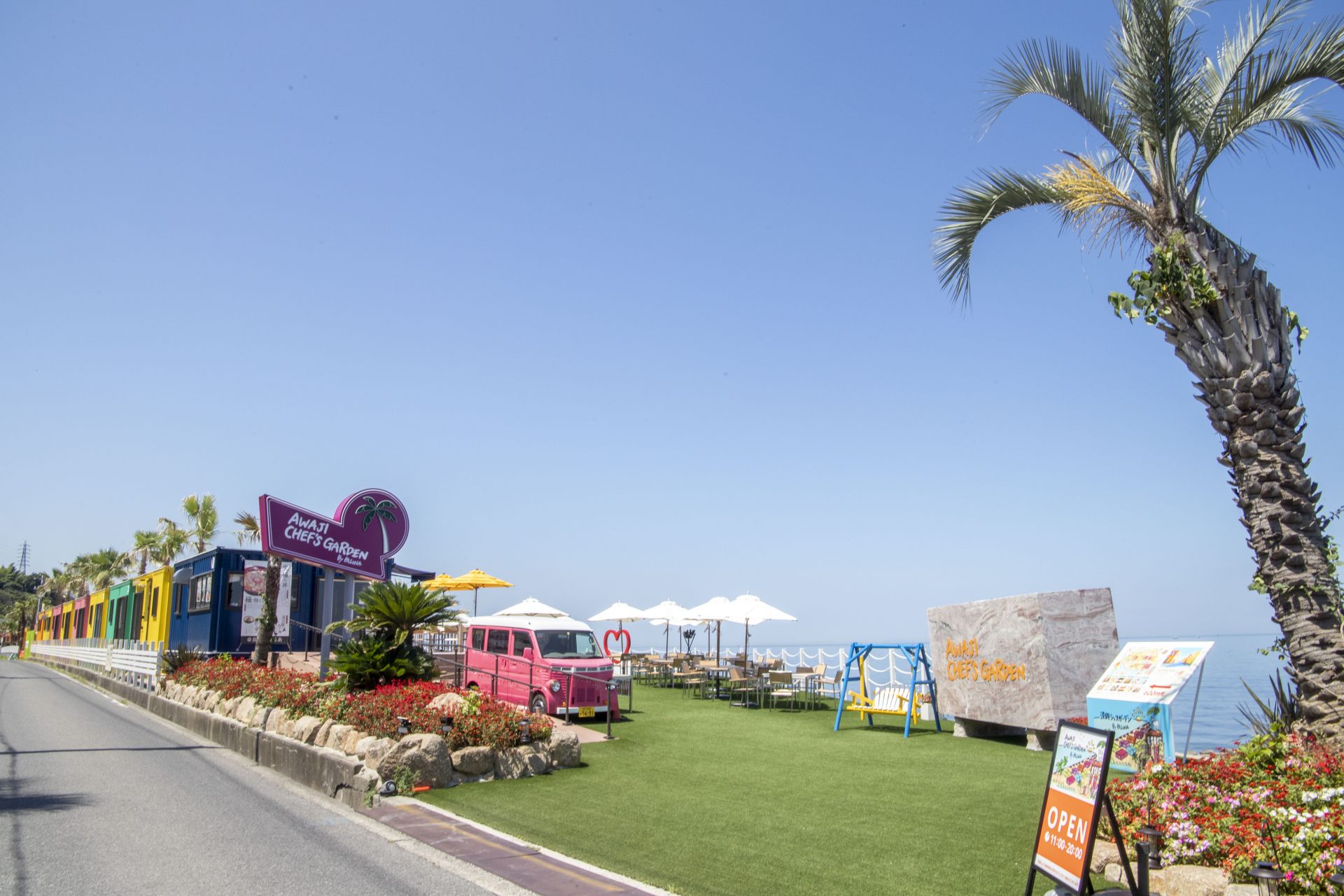 淡路島の西海岸エリアを中心に、海の絶景を眺めながら食事やティータイムを楽しめる絶景カフェ。太陽の光に照らされキラキラと輝く日中や、赤く染まる夕日を望む夕暮れ時など、時間帯によって表情を変え、食事に彩りを与えてくれます。2023年には、全国の人気店がカラフルなコンテナや海沿いのテラス席で、淡路島の新鮮食材を使ったグルメを提供する屋外型フードリゾートが東海岸から西海岸へ移転。ますます盛り上がりを見せています。