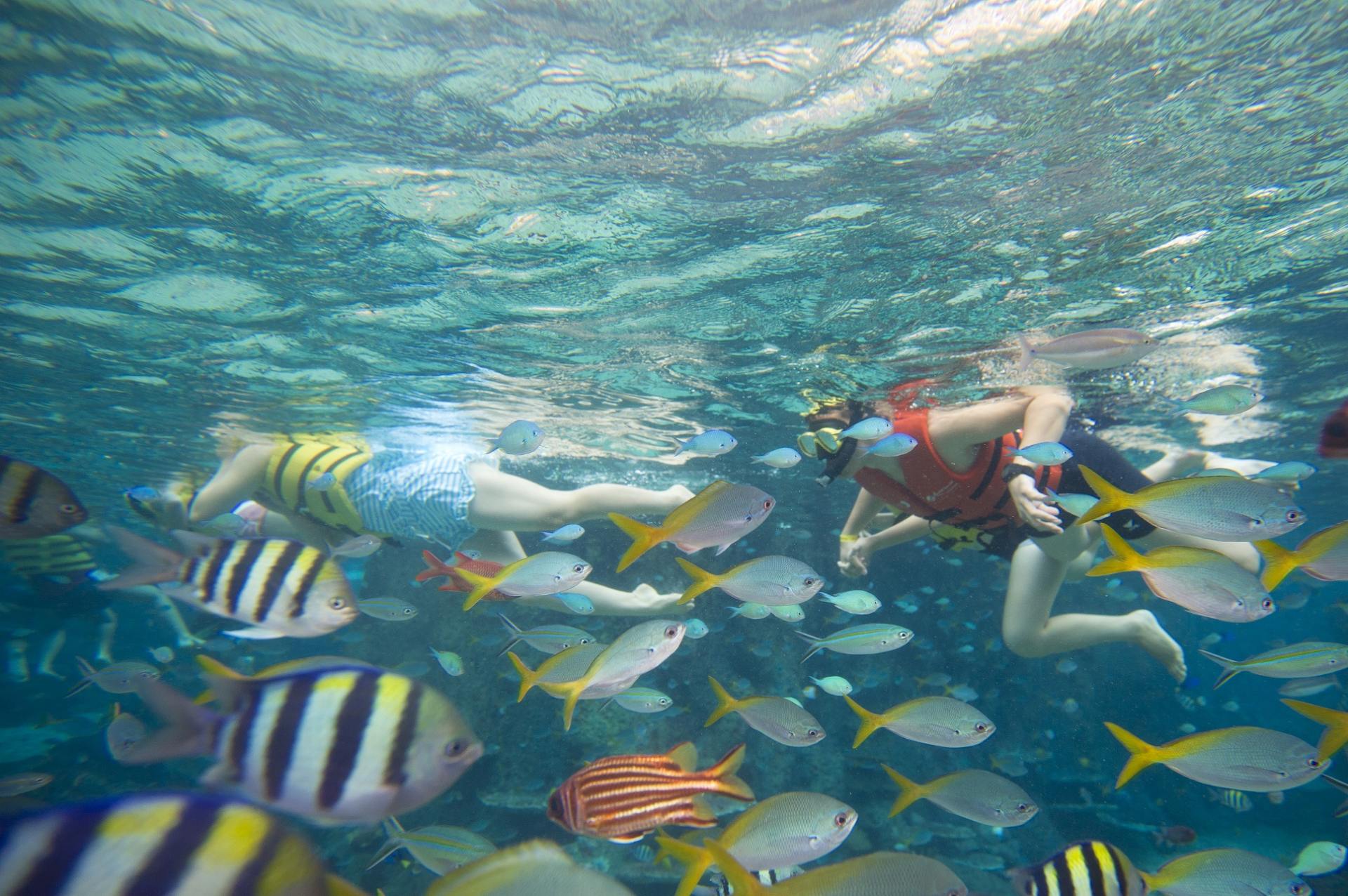 そして、珊瑚礁でのスノーケリング体験も! 「レインボーリーフ」では、ライフジャケットを身に着けて、2万匹を超える熱帯魚を間近で観察できます。水中のカラフルな世界にテンション上がりっぱなし! ほかにも、波のプール「ブルーウォーターベイ」や、エイに触れたり餌やり体験ができる「レイベイ」などがあります。