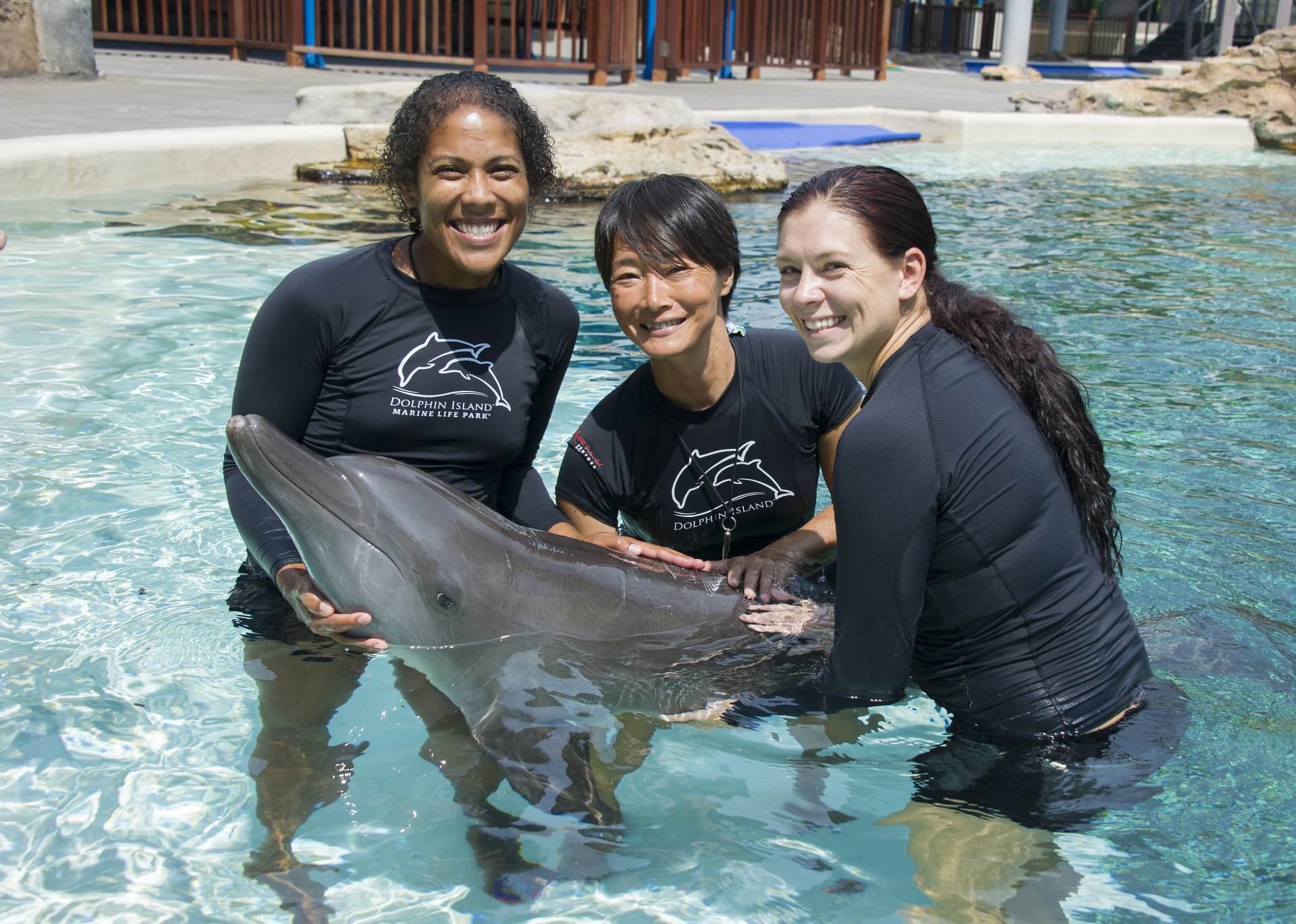 「ドルフィンアイランド」では、イルカを観察し触れ合う普段なかなかできない貴重な体験ができます。触れ合いから一緒に泳ぐまで、5つのプログラムが用意されています。4歳以上誰でも体験できておすすめなのが「ドルフィンディスカバリー」。人懐っこくて賢いミナミハンドウイルカの生態を学びながら、握手をしたり撫でたりと、浅いプールでイルカたちと触れ合えます。