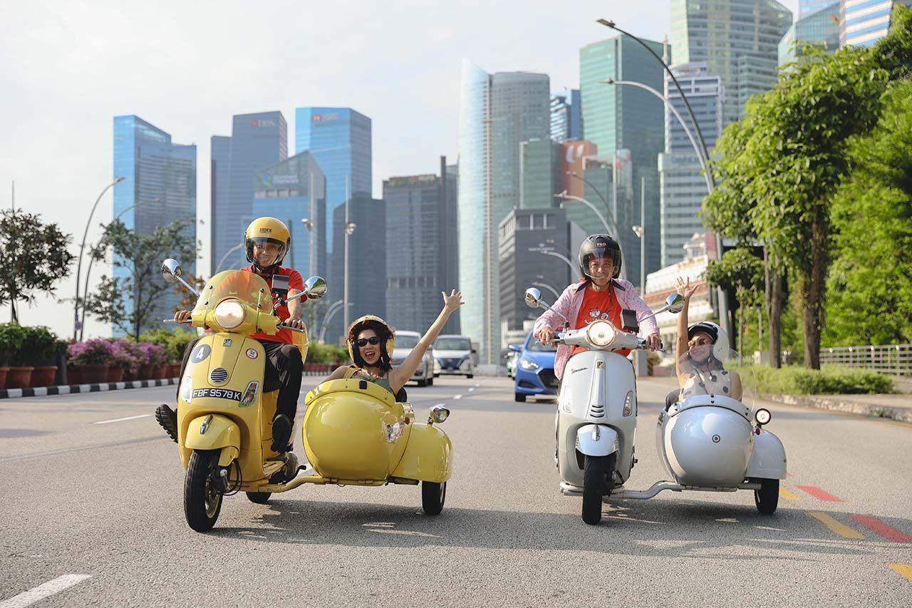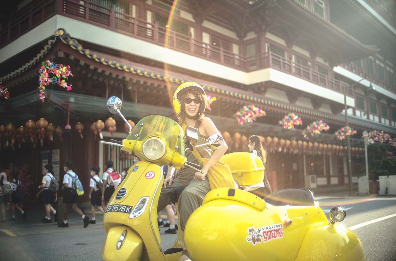 そんなさまざまな歴史・文化地区を一度に見て回るのにおすすめなのが、「シンガポール・サイドカー」が催行するサイドカーツアー。大型バスと違って、小回りの効く車体は大きなアドバンテージとなり、歴史・文化地区の狭い路地にも入り込み、シンガポールの多文化共生をディープに感じることができます。またイタリア発祥のスクーター、ベスパのヴィンテージサイドカーは、道ゆく観光客たちからも注目の的となり、実際こちらに乗車したSAKIEさん、YURIEさんも、この時ばかりは二人がたくさん写真を撮られる側に回っていました。