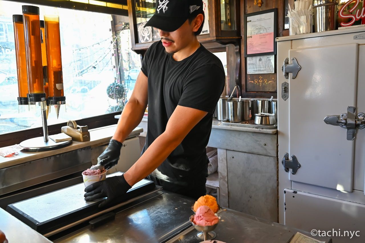 家族や友人と一緒に訪れるのに向いている店ですが、筆者はデート、特に1回目のファーストデートにぴったりだと思います。ファーストデートなら、適度にざわざわとしたカウンター席が緊張しなくていいでしょう。肩を並べてアイスクリームを作る様子を眺めていれば、好きなアイスクリームの種類から子供時代まで、話が弾むかもしれません。アイスクリームを分け合って食べる頃には、店に入る前よりずっと、お互いを知り合っているでしょう。