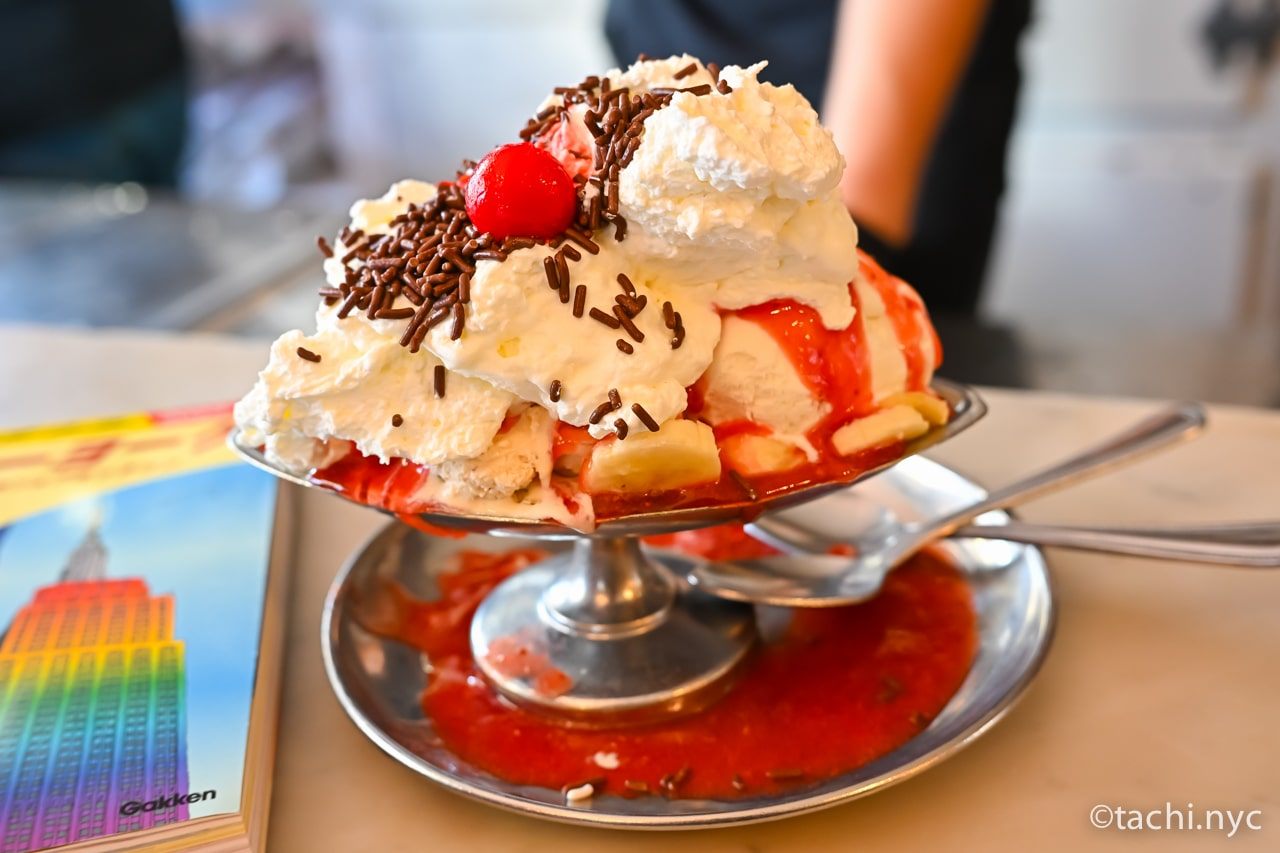 同行した家族と一緒にひとつを分け合いましたが、ふたりとも夕飯時にお腹が空かないほどのボリュームでした。物価の高いニューヨークでバナナ・スプリットが12ドル(チップ別)という値段は、かなり良心的です。