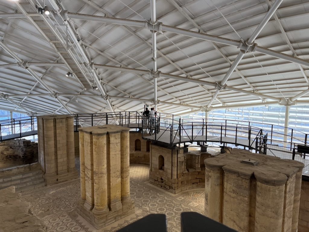 この宮殿は今から約1300年前にあたる8世紀前半ごろのウマイヤ朝時代に建設され、初期のイスラム建築を代表する遺跡として、考古学の世界では広く認知されています。その最大の特徴は、中東最大級のモザイク床。