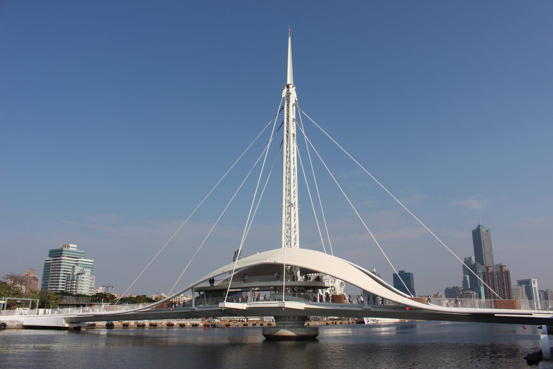 高雄港沿岸のリノベ倉庫街、駁二藝術特區大義倉庫の対岸に新たなリノベ倉庫、大港倉が登場。ふたつのエリアは2020年に完成した大港橋でつながっています。橋の中央の展望スペースからは、愛河の河口に登場したユニークな巨大建築、高雄流行音樂中心とその周辺の景色を楽しめます。またこの橋は、15:00(土・日・祝は19:00も)に約30分かけて旋回。その様子はショーとして訪れる人々の目を楽しませています。