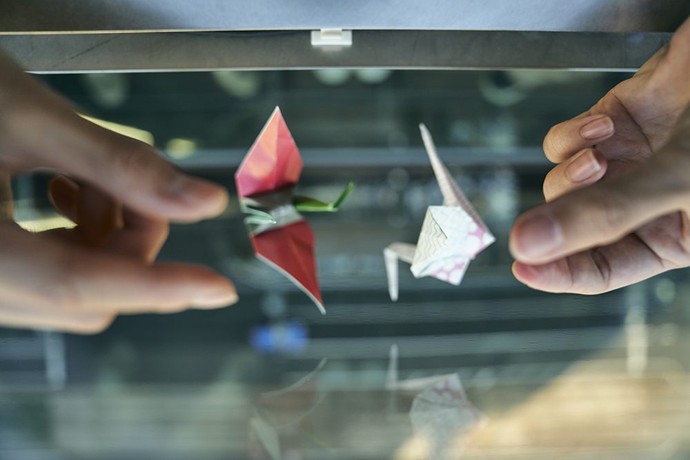 「おりづるタワー」には物産館があり、県を代表する銘品や地元で愛されているお土産など、約1,000点が取り揃えられています。その他注目は来館者の想いのこもった折り鶴でいっぱいになる「おりづるの壁」。ここでは専用の折り紙で鶴を折り、約50mの高さから折り鶴を投入する体験ができます。壁はガラス張りの吹き抜け空間になっているため、外から見れば幾層もの折り鶴で彩られた圧巻の光景が!来館者みんなで作り上げる、広島でしかできないユニークな体験です。