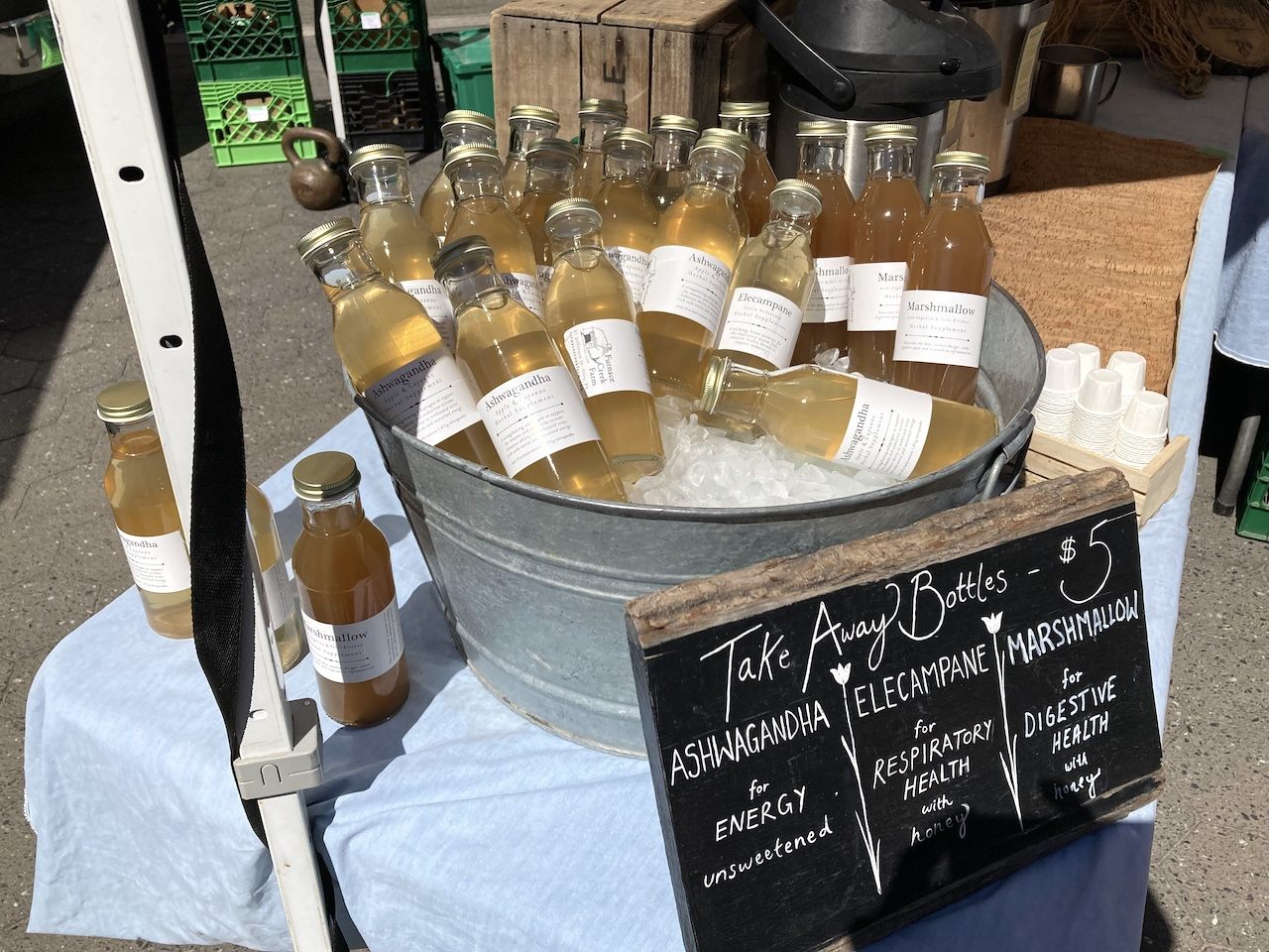 グリーンマーケットでは、アップルサイダーのほかに、ハーブ系のドリンクやスムージー、ミントのアイスティー、乳製品飲料などその場で楽しめるものが各農家から出ています。