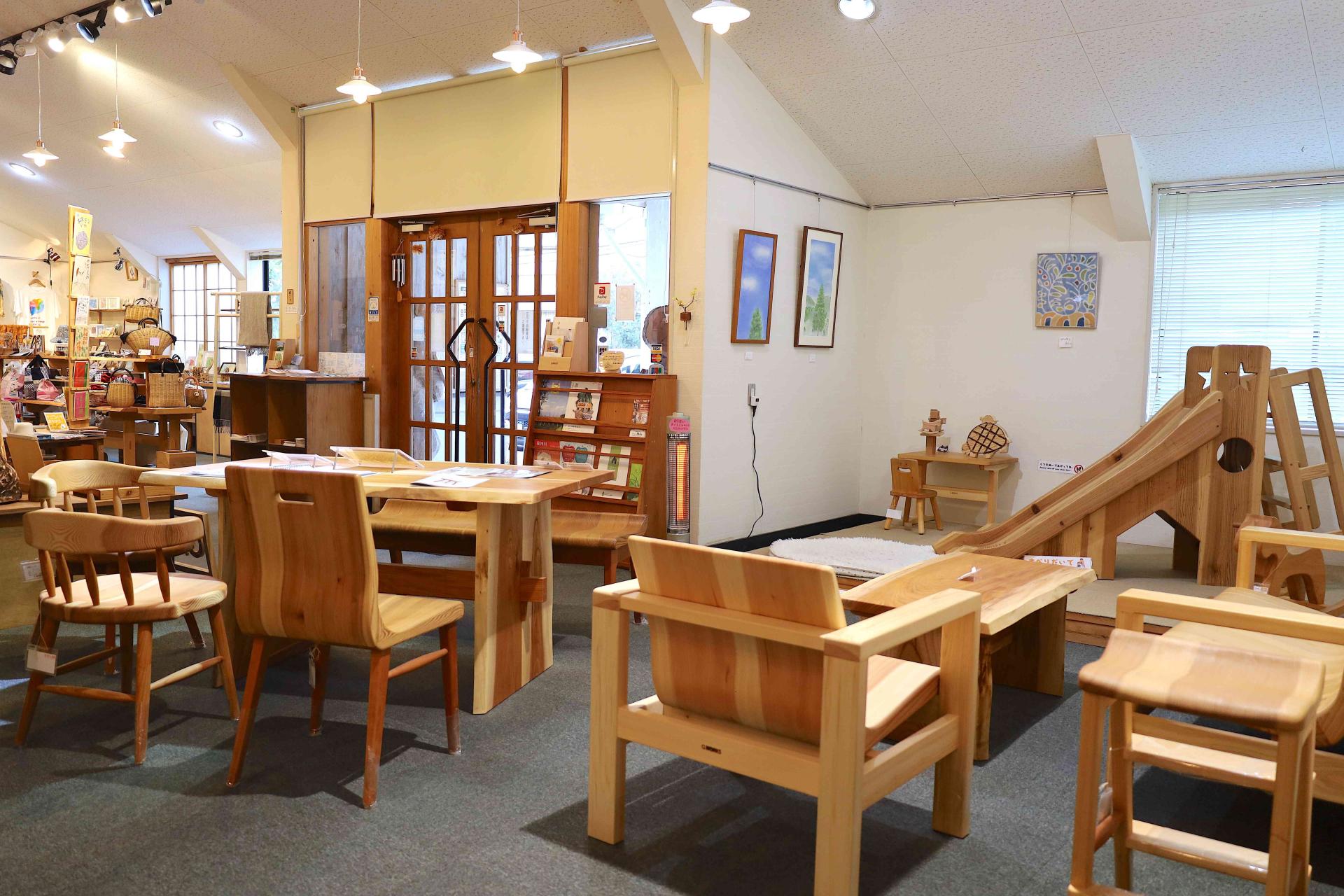 館内に入った瞬間「あっ木だ! すごい木の香りに包まれています」という第一印象の丸田さん。建物は計画段階から、木材関係者らが参画したこともあり、外壁のみならず、フロアの床や天井の各所に紀州材が多用されています。また販売商品が並ぶラック、カフェのテーブルには「あかね材」のアイテムをセレクトしているのも特徴といえるでしょう。