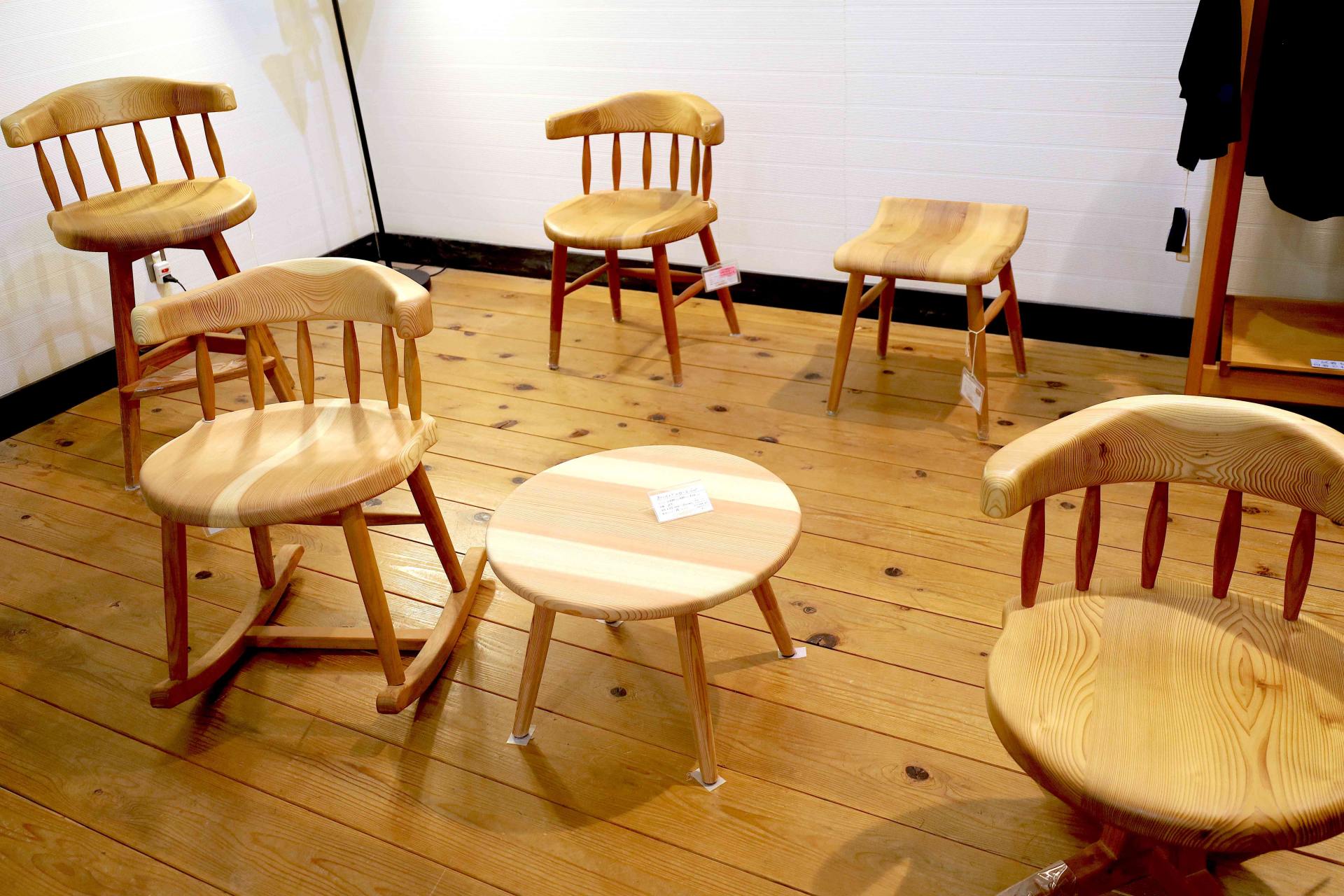 取り扱っている椅子のタイプ様々ですが、オンリーワンの魅力ともいえる愛らしいフォルム、分厚く切り取った背もたれなどの特徴は共通していて、一度腰掛けると体のラインにフィットするような座り心地に誰もが驚かされるはず。スギのほかに、ケヤキ・ヒノキ・ヤマザクラといった紀州材の材質を選ぶことのできる受注生産型のテーブルも人気です。