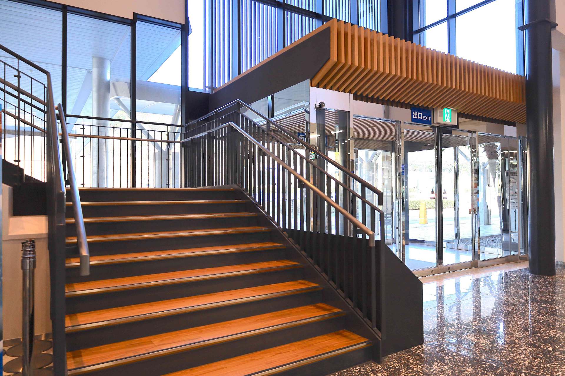 木の国・和歌山県の方針に基づき、近年、県内の公共建築物の多くで木質化(木造化)を推進。白浜町の玄関口ともいえる熊野白浜リゾート空港でも、壁や階段の一部、ベンチなど随所に紀州材が使われており、洗練された現代的な建物のなかで温かみのあるエッセンスがプラスされています。