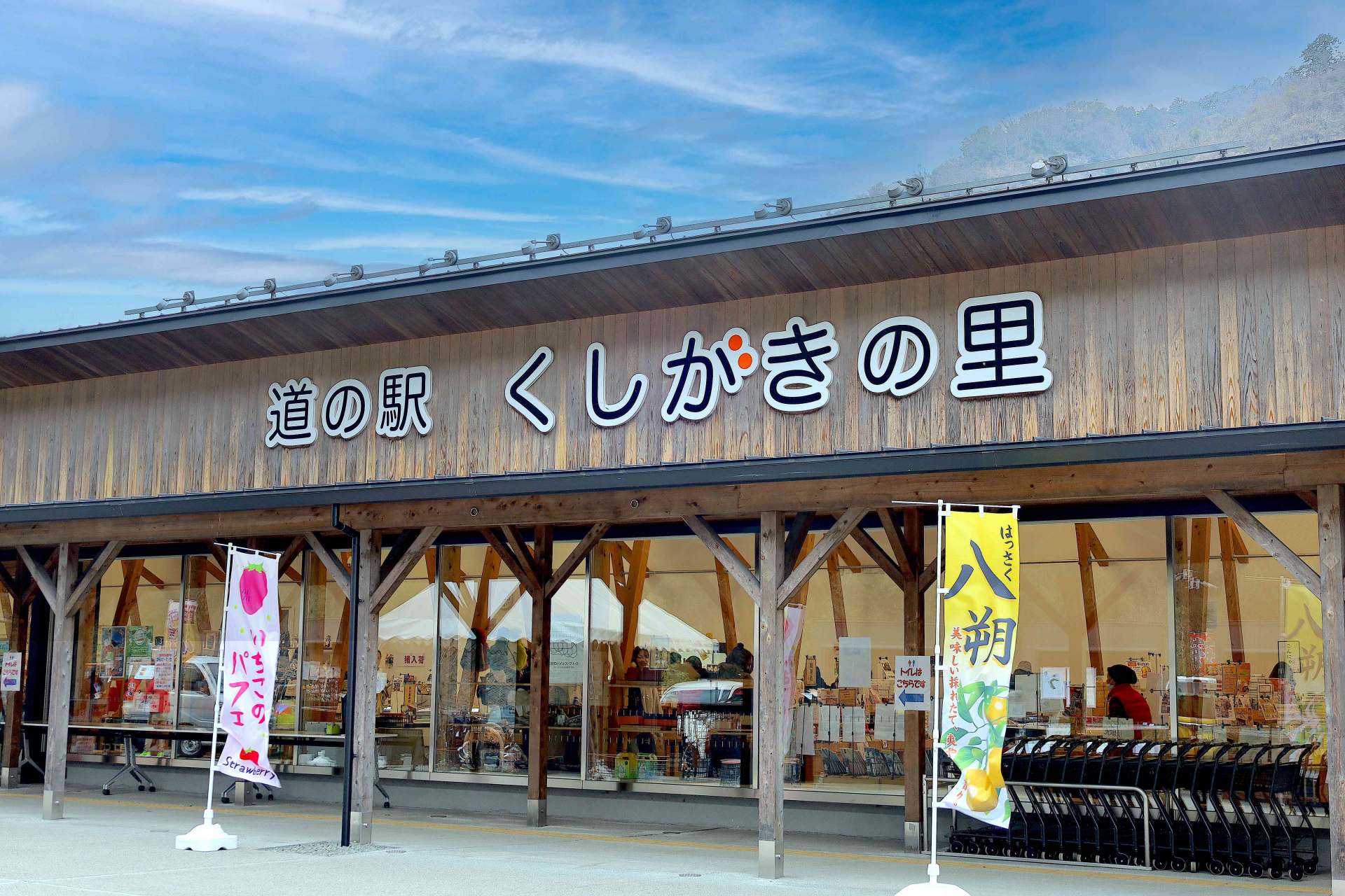 回廊でつないだように並ぶ4棟の建物で構成された道の駅で、いくつもののぼりが立つ賑やかな雰囲気が魅力。現役の農家さん3名が経営しているのも特徴的です。和歌山と大阪の県境をまたぐ国道480号沿いにあり、かつらぎ町の北の玄関口として交流拠点の役割を果たしています。