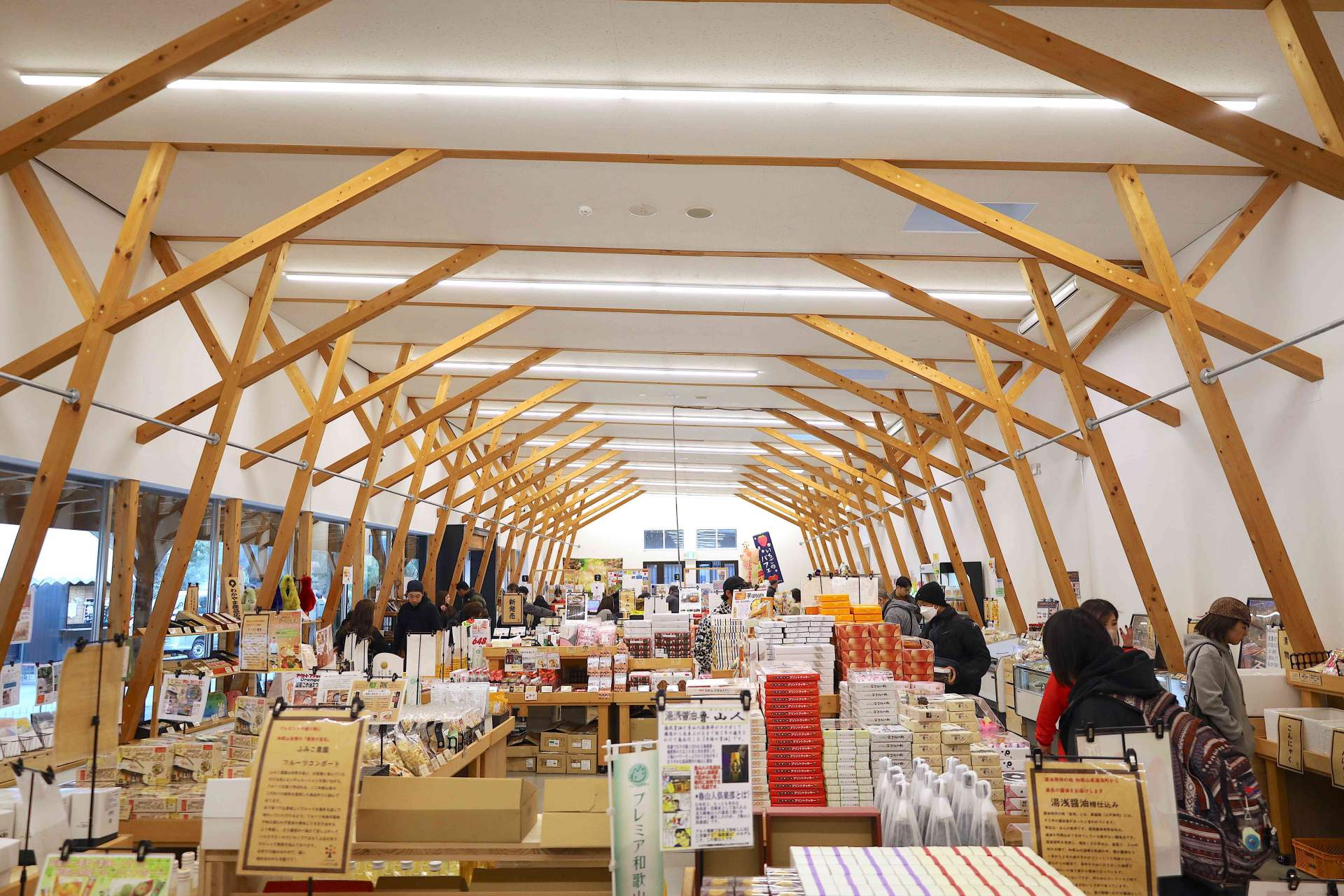 また、物産コーナーがメインの棟はさえぎるものがない無柱空間が広がっています。それを実現するために無垢の流通規格材を組みあげて建物を支え、あえて剥き出しにすることで木の質感を生かしているそう。一方で、耐候性の高い金属パネルを随所で取り入れ、耐久性に配慮している点も見逃せません。