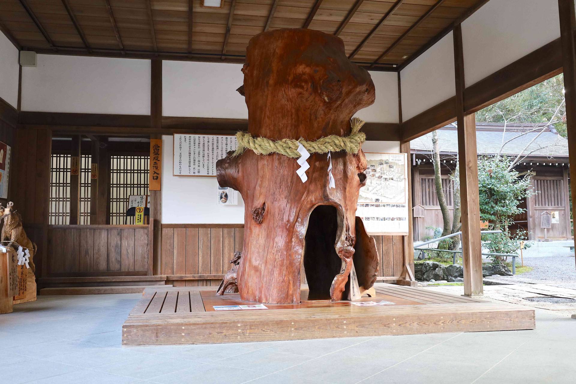 境内には、樹齢800〜1000年ともいわれるご神木の大杉が鎮座しています。1962年の落雷で惜しくも炎上してしまいましたが古幹は現存。屋根のある割拝殿に保存され、「木の俣くぐり」を体験することができます。