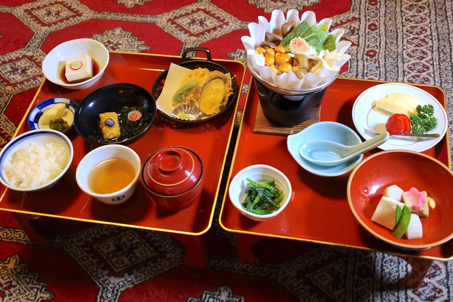 院内の静かな一室でふるまわれる昼食(予約制)は、五法・五味・五色を忠実に守った精進料理です。野菜や海藻はもとより、豆類、山菜もふんだんに盛り込んだメニューの数々は心にも体にもやさしい美味しさ。美食揃いのラインナップで「胡麻豆腐など高野山で食べたいメニューがラインアップしている感じ。天ぷらや鍋もあって、美味しいうえに、ボリュームも十分です」と丸田さんも満足なご様子。なお宿泊客には朝勤行、護摩祈祷の参加をはじめ、阿字観、お写経といった体験も用意しています。