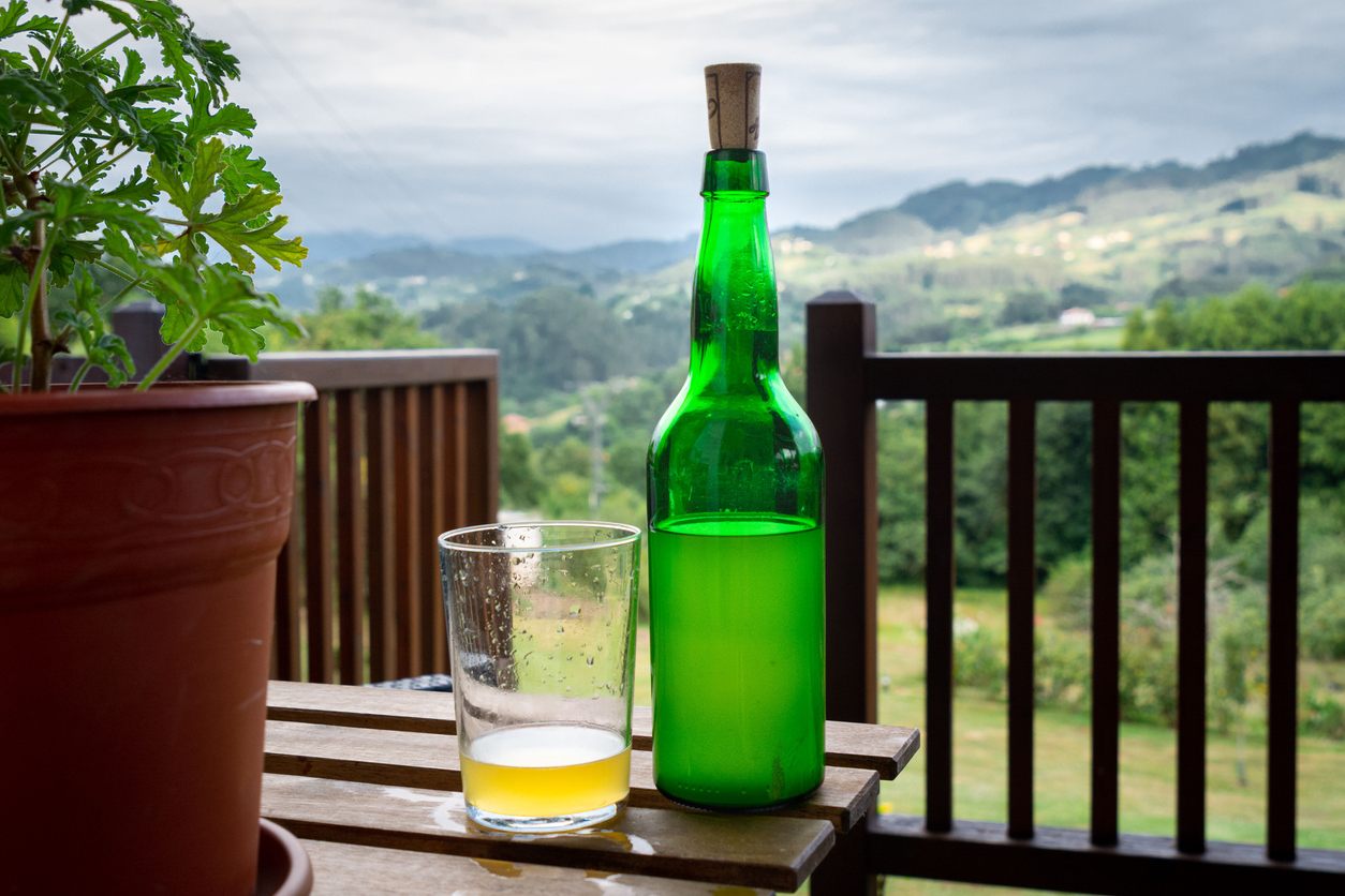 前述したように、いわゆるシードルのことを、スペインではシードラと呼びます。製法はいたって単純で、リンゴの果汁をしぼり発酵させるもので、樽内で熟成し微発泡の状態で瓶詰めされます。飲み方も独特です。開封されたシードラの瓶を頭上高く持ち上げ、もう片方の手にシードラ用の広口のグラスを持って腰より低く構え、そこへ頭上から一気に注ぎ込む。これにより、微発泡状態のシードラがより泡立ち風味が増すという仕掛けです(バスクでも似たような注ぎ方が知られますが、こちらはチャコリという微発泡白ワインで、シードラではありません)。
