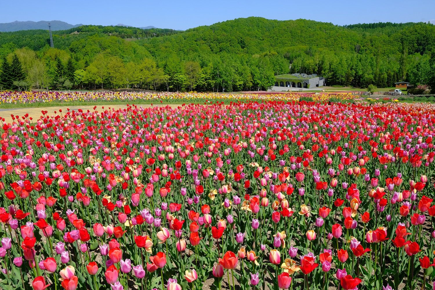 札幌市南区にある北海道唯一の国立公園がここ「国営滝野すずらん丘陵公園」。4つのゾーンからなる400ヘクタールものフィールドで、滝巡りや森の中の散策道で自然と触れ合うことができます。花畑があるのは中心のカントリーガーデン。春はチューリップ、夏はヒマワリや青いネペタ、秋はコスモスが周囲を取り巻く緑の森を彩ります。なかでも156品種、約25万本のチューリップの花畑は感動的! 見頃は5月中旬~6月上旬で、5月18日〜6月2日には「チューリップ・すずらんフェスタ」も開催されます。