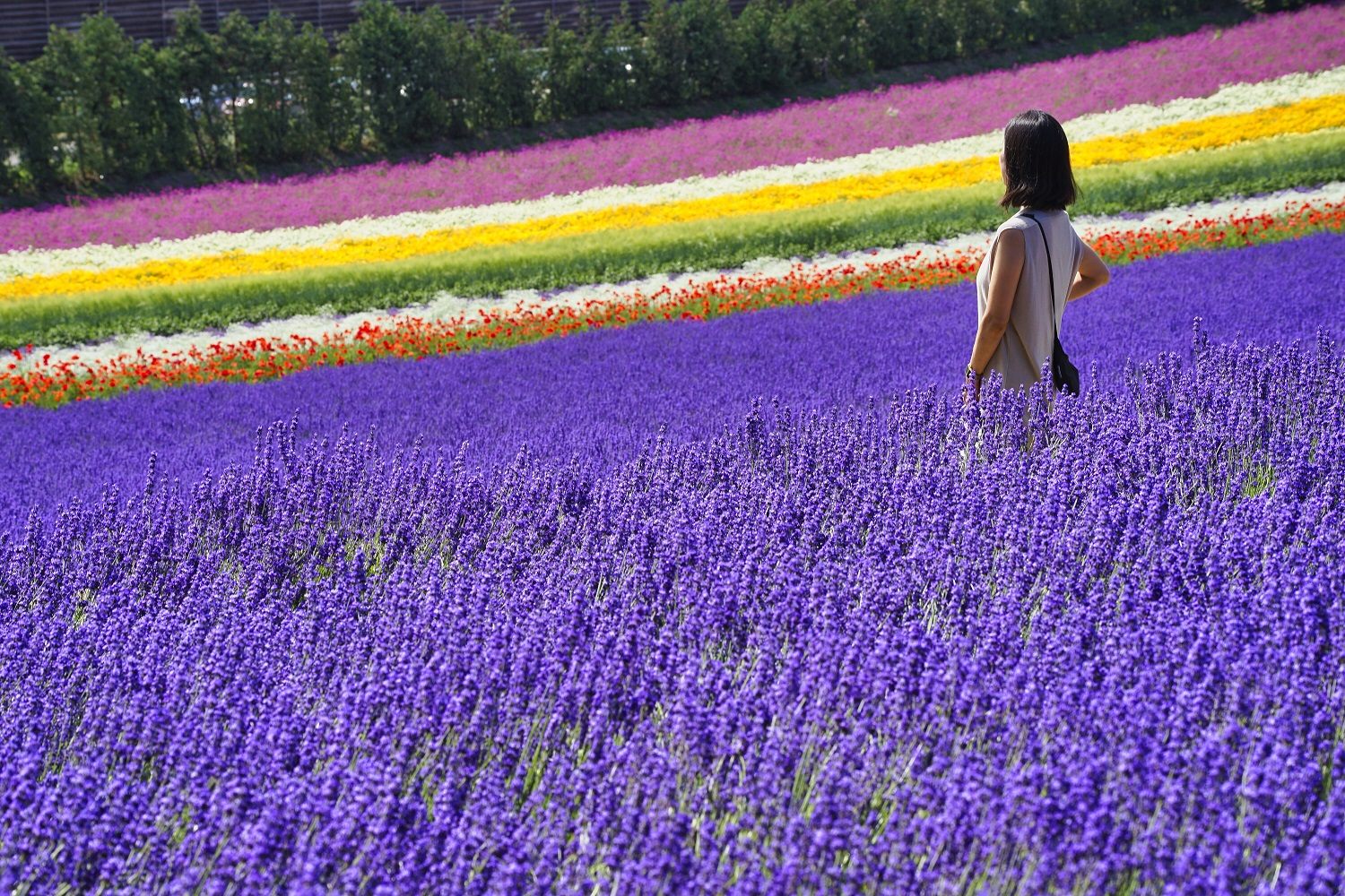 写真などで一度は目にしたことがある、レインボーの花畑が見られるのは富良野にある「ファーム富田」。13もの花畑があり、春から秋にかけてさまざまな花が咲き続けます。「彩りの畑」は紫のラベンダー、オレンジのカリフォルニアポピー、白いカスミソウ、ピンクのコマチソウなどが作り出す花々のストライプが、青い空に浮かび上がる一番人気の花畑。ただし、種類の違う花が植えられているため、花々の最盛期が揃うのは7月中旬〜下旬の短い期間。奇跡の絶景でもあるのです。この時期には世界から観光客が集まってくるので、時間に余裕を持って出かけましょう。