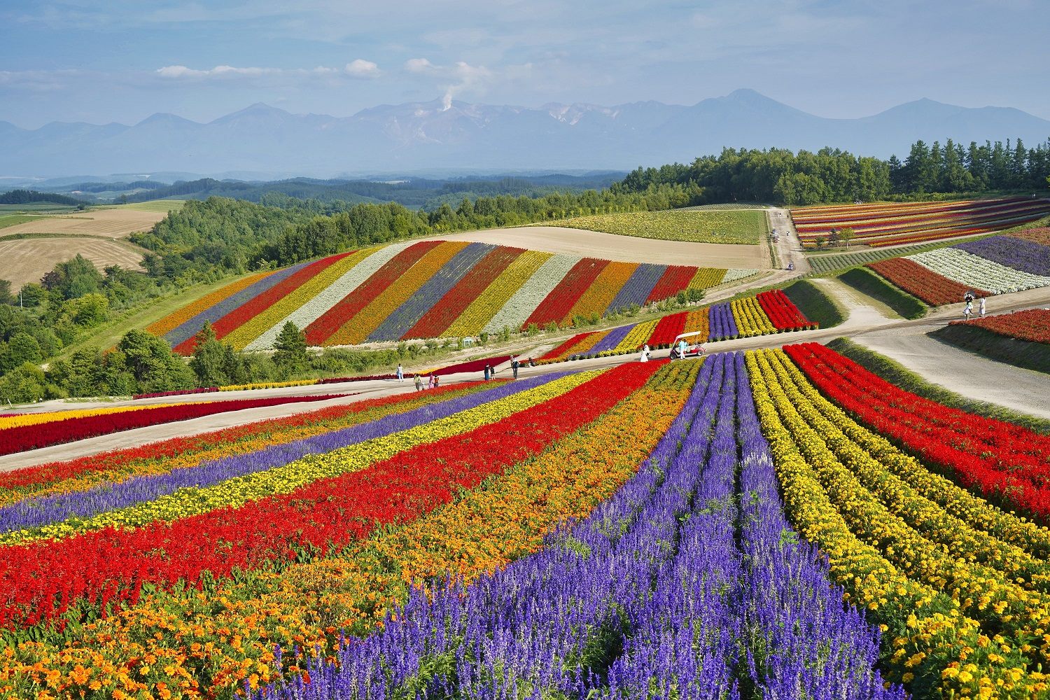8月はもうひとつ見逃せない花畑があります。丘風景が美しい美瑛の「展望花畑 四季彩の丘」です。丘全体が花畑という、想像を絶するスケールの大きさ。鮮やかなストライプのカーペットを大地に敷き詰めたような光景は、一見の価値ありです。7月上旬から花の色がだんだん濃くなり、8月中旬がもっとも鮮やかになるベストシーズン。大きな花のハートも登場します。広い園内はトラクターバスや、自分で運転するカートで巡ることもできます。