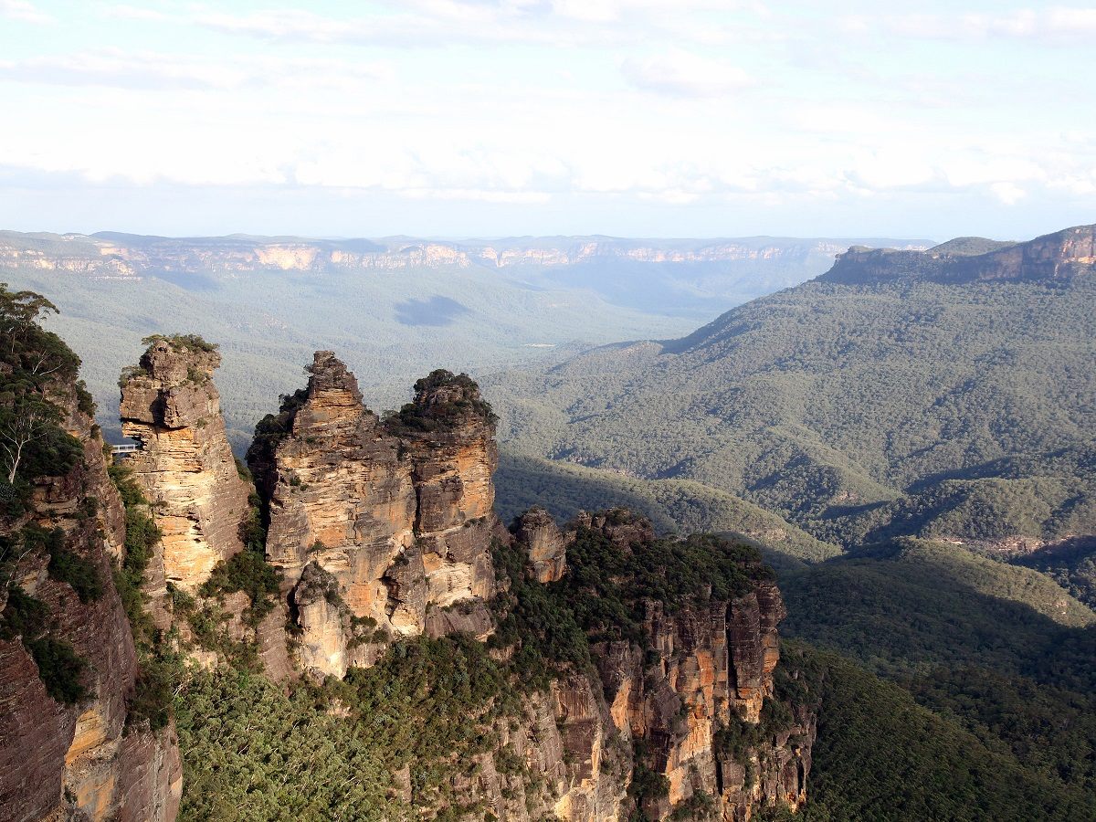 オーストラリアの東海岸に沿って連なる大分水嶺。シドニーの西、その分水嶺の一角を占めるのが世界自然遺産「グレーター・ブルーマウンテンズ地域」。大分水嶺の渓谷一帯を埋め尽くすユーカリの葉に含まれる油分が大気中に揮発して太陽光に照らされると、まるで青いフィルターがかかったようになることから、この名が付いたといわれています。