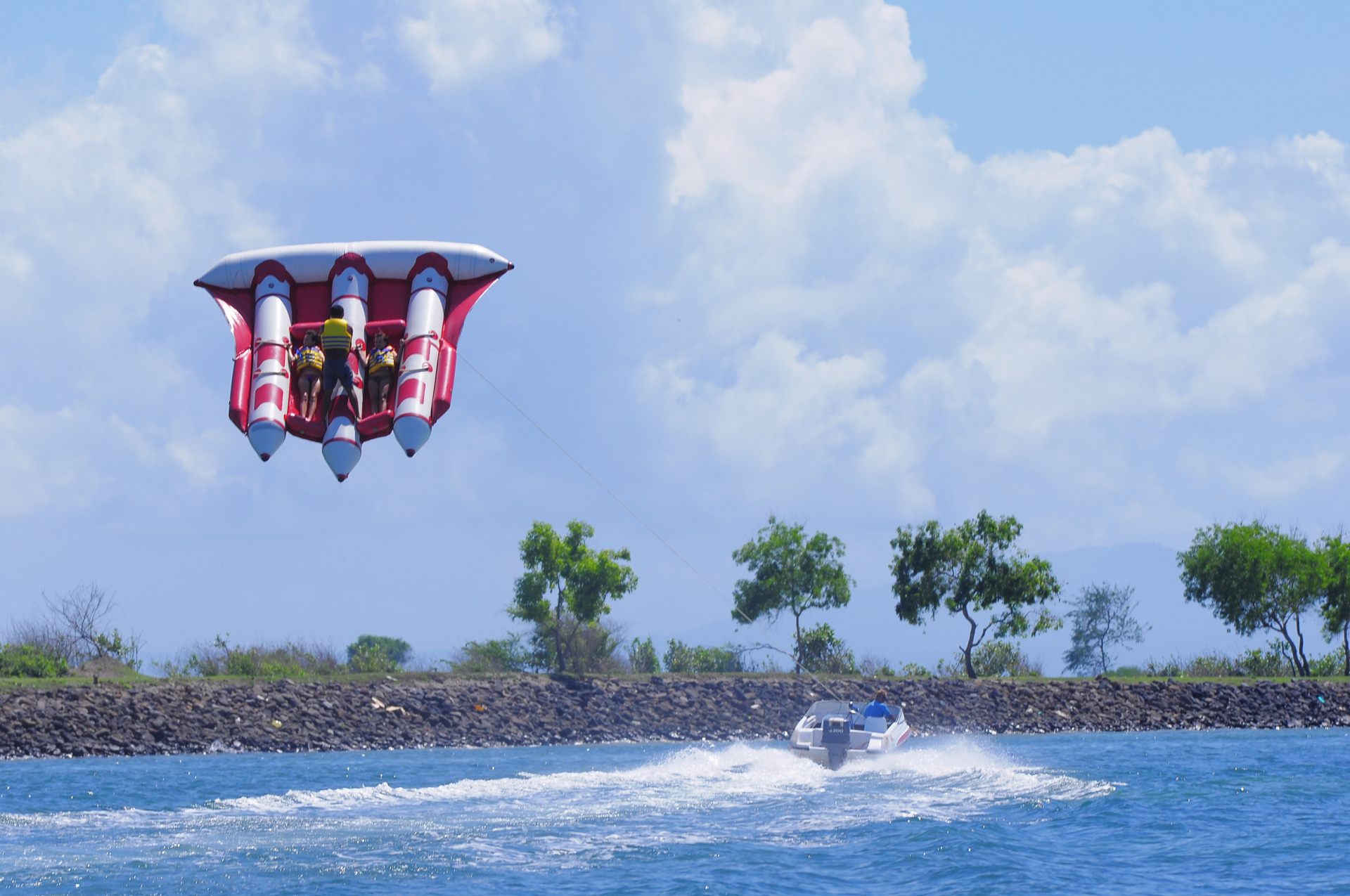 ヌサドゥアの北側にあるブノア岬はバリ最大の海遊びスポット。ビーチ沿いに数十軒のマリンスポーツショップが並び、日本ではあまり見かけないアクティビティにも挑戦できます。フライフィッシュはスピードボートで引っ張られて波間をランディング。凧揚げのような要領で最大5mほど飛び上がります!
