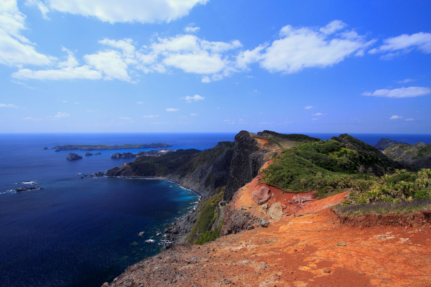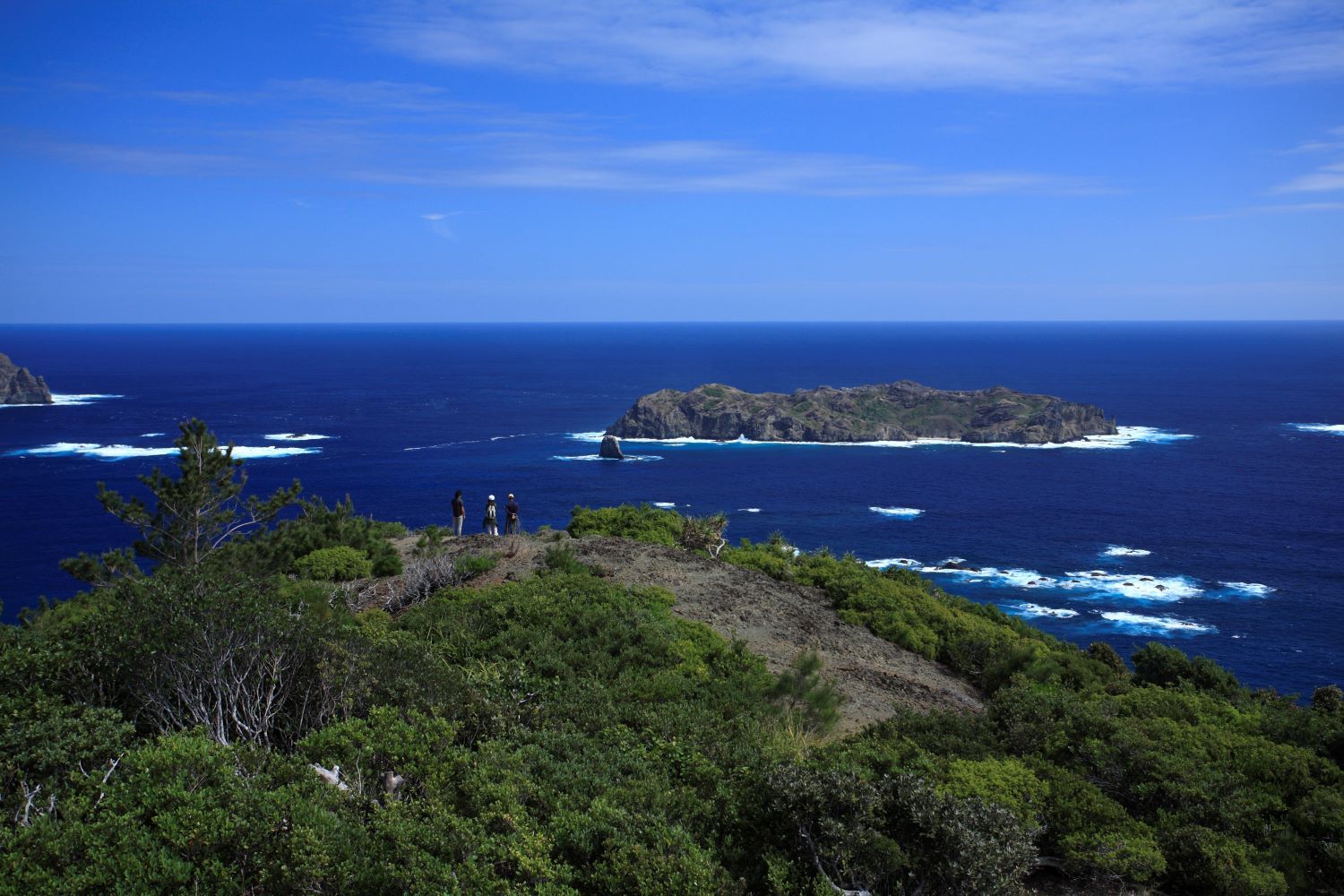 ハートロックの頂上は、目の前に何も遮るものがない断崖絶壁。ボニンブルーの水平線をたどると、南島や母島までを一望でき、その絶景に胸を打たれます。