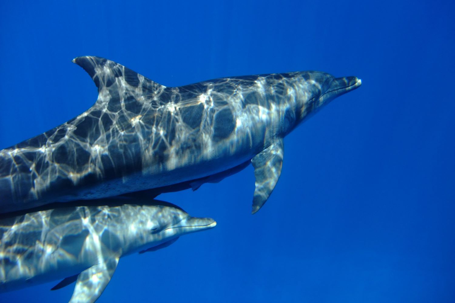 小笠原の海はとても透明度が高く、明るい海中で見るイルカたちの姿は神秘的。かわいい赤ちゃんイルカが見られることもあります。