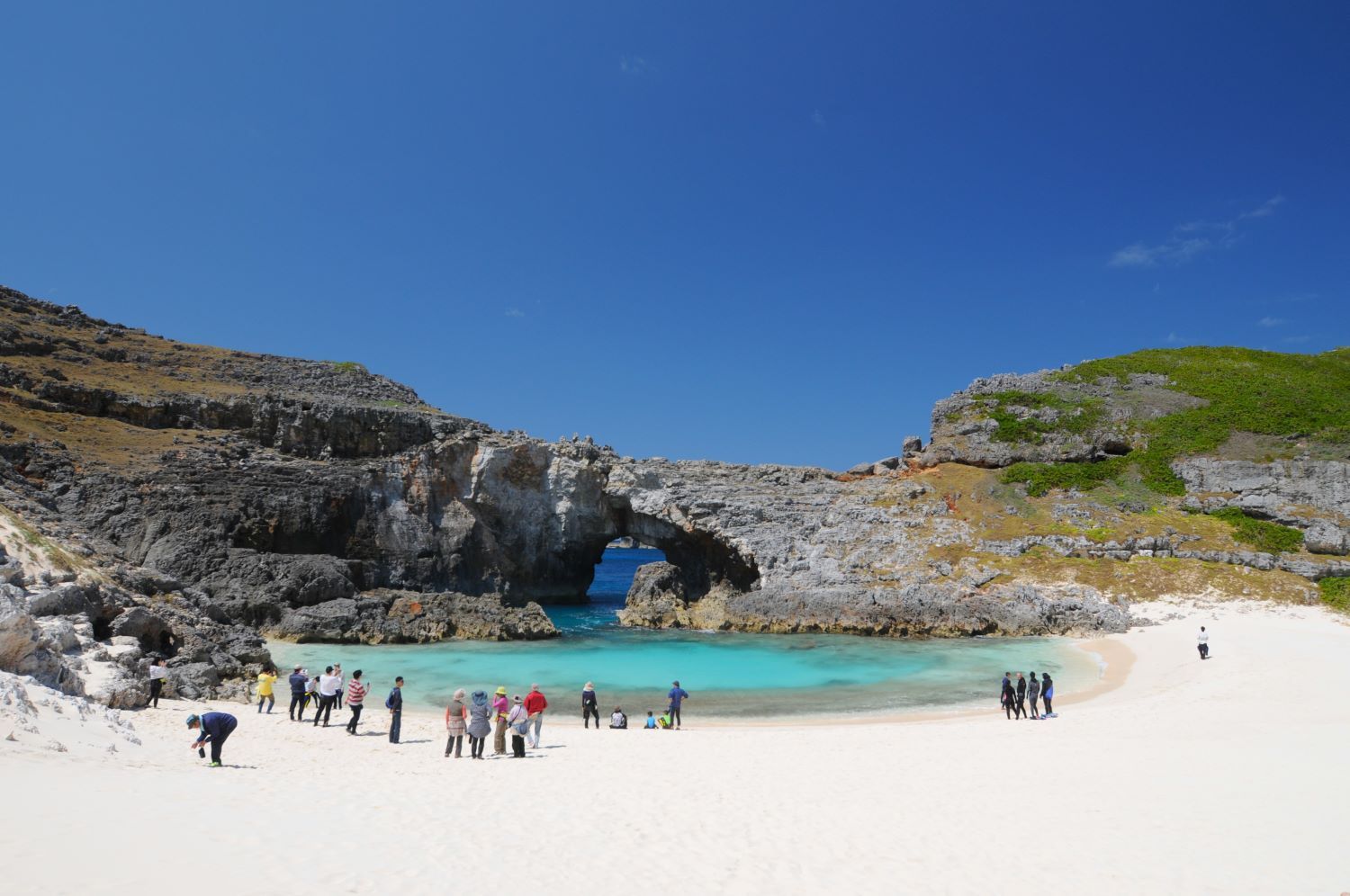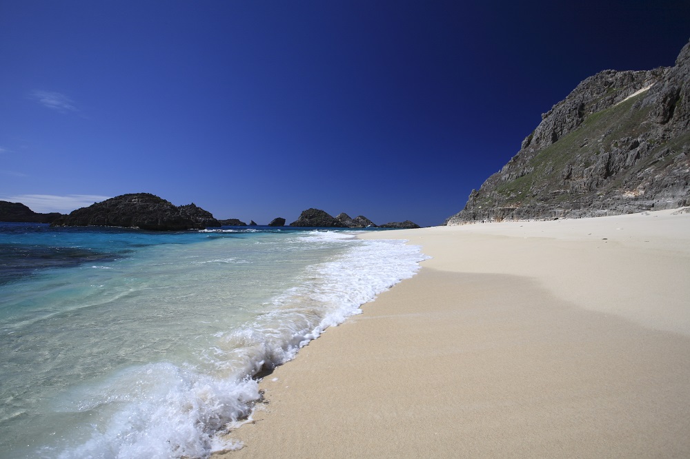 ドルフィンスイムを楽しみながら、父島から1kmほど南西に浮かぶ南島へ向かいます。この島は沈水カルスト地形という特殊な形状をしており、周囲の海域とともに世界遺産に含まれています。鋭く尖った岩に囲まれたくぼ地には、眩しいほどの白砂が広がり、ソーダ色の海に感激すること間違いなし!