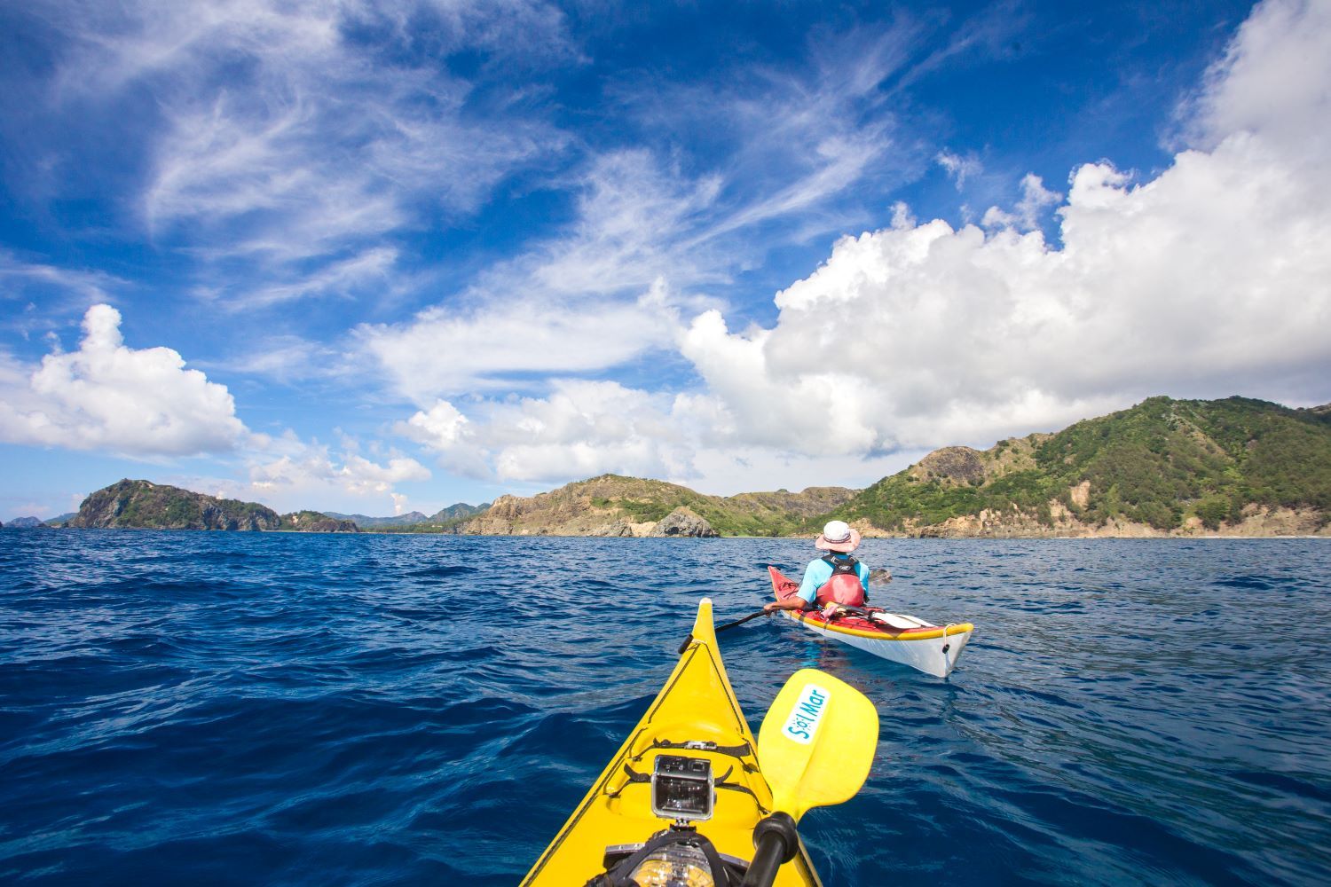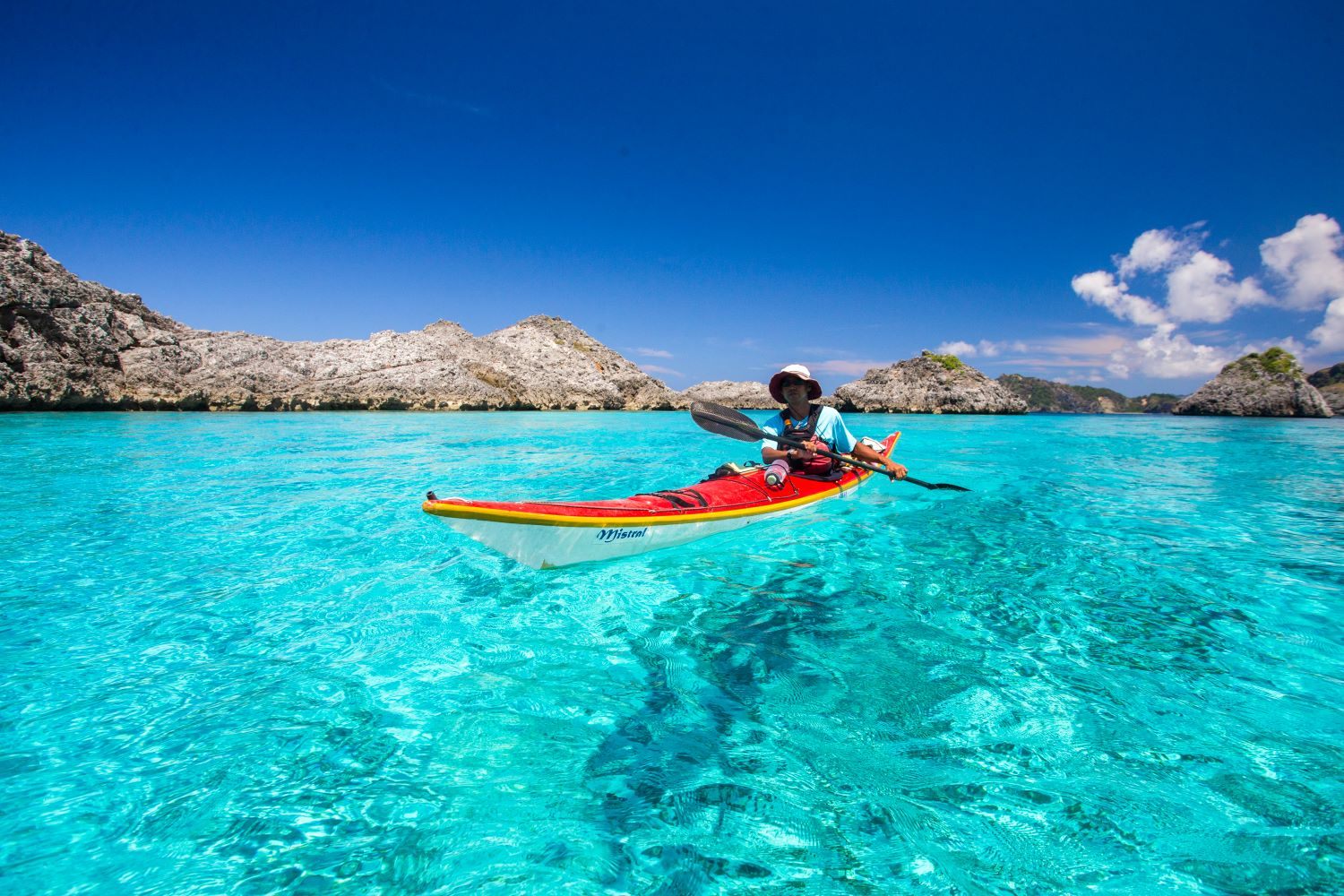 真っ青な海を滑るように進むシーカヤックも人気ツアーのひとつ。エンジンを使わないので、聞こえるのは水をかくパドルの音くらい。雄大な自然に包まれているような、心地よい体験です。