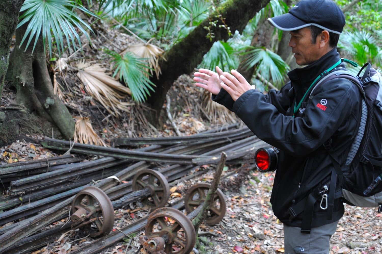 戦跡ツアーでは、森の中を歩きながら壕の中に入ったり、大砲を間近に見たり。ガイドさんが戦時の歴史や戦跡の使用目的、製造秘話などを教えてくれ、昔、社会の授業で学んだことを実際に見て聞ける貴重な体験です。点在する食器には日本軍の印章が確認でき、急に戦争が身近なものに感じられます。
