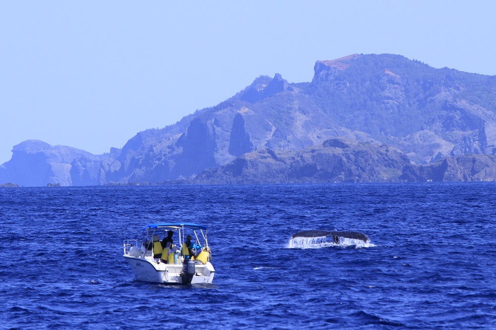 冬の小笠原旅行でハイライトとなるのが、ホエールウオッチング。小笠原周辺の海域には、12月から5月上旬にかけて、出産・子育てのためにザトウクジラが回遊してきます。ツアーでは、ボートに乗ってクジラを探し船の上から観察。豪快なブロウ(潮吹き)やジャンプをする姿に大興奮!