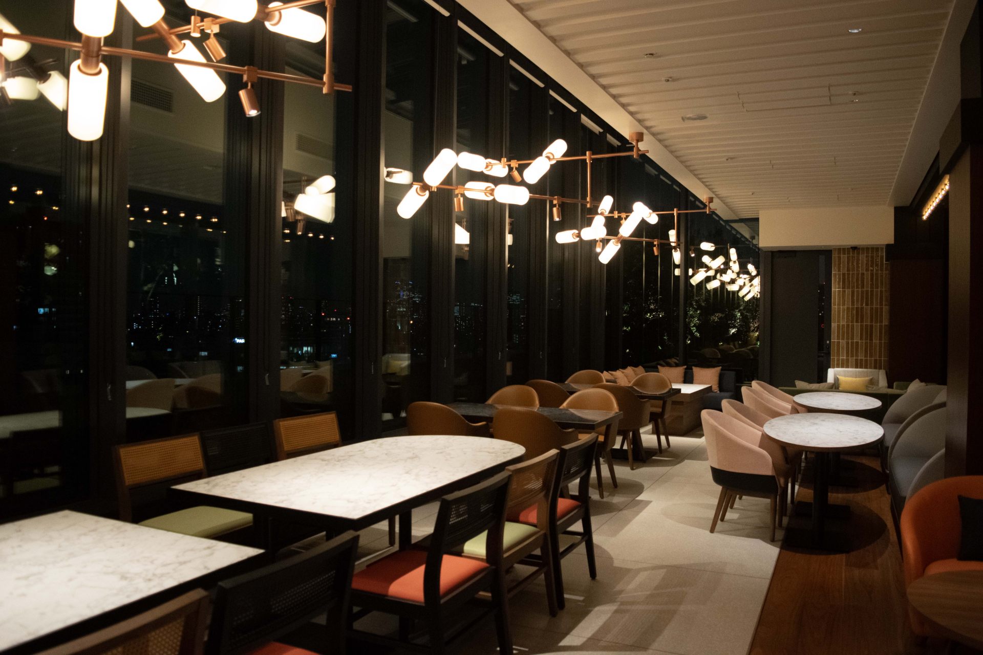 14階にあるOMOカフェ&バルでは、ソフトドリンクやアルコールのほかに、クロワッサンやパフェ、カレーなどの軽食が用意されている。天気がよければ空中庭園のテラス席で食べることも可能。