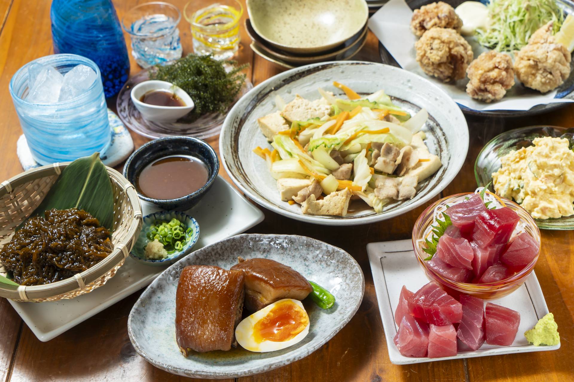 平良に戻ってディナーは「芳野商店」へ。宮古島産のキハダマグロや、採れたての海ブドウやモズクなど、ほかではなかなかお目にかかれない新鮮な素材を用いた料理が、リーズナブルに味わえます。特に「名物!こぼれまぐろ刺し」(748円)は驚きのコストパフォーマンス。ラフテーやチャンプルなど、定番の沖縄料理から居酒屋メニューまでさまざまな料理が楽しめます。