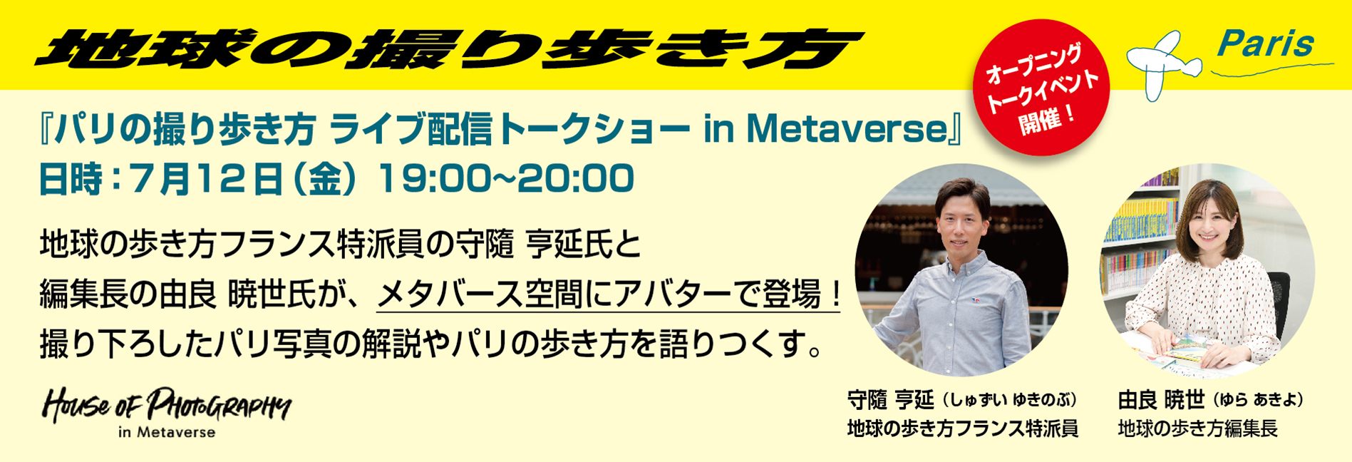 メタバース上で地球の歩き方の写真展『地球の撮り歩き方 in Paris 旅先の感動を、写真ともっと(以下、地球の撮り歩き方)』を開催します。会期は前期が2024年7月12日~7月25日、後期が7月26日~8月8日。7月12日にはオープニングイベントとして地球の歩き方編集長の由良暁世と今回パリの撮影をした地球の歩き方パリ特派員の守隨 亨延が登壇するトークショーがメタバース空間内で実施されます。新感覚の写真展&イベントを体験してください。