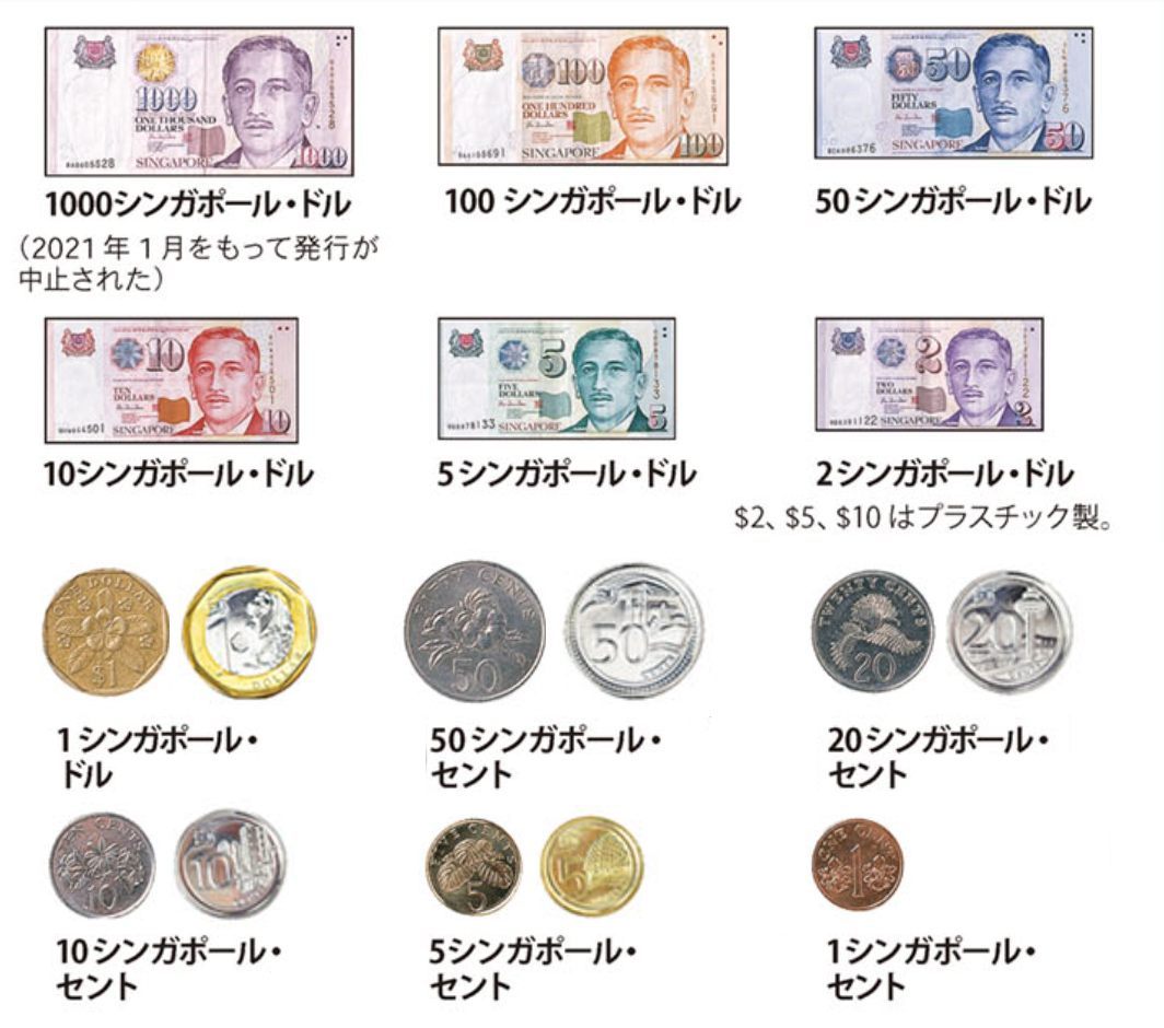 通貨単位はシンガポール・ドル(記号はS$)、補助通貨単位はシンガポール・セント(記号はS¢)。紙幣はS$2、5、10、50、100、1000、1万の7種類。硬貨はS¢1、5、10、20、50、S$1の6種類(S¢1硬貨はほとんど流通していない)。また、2013年に新硬貨5種類が発行された。