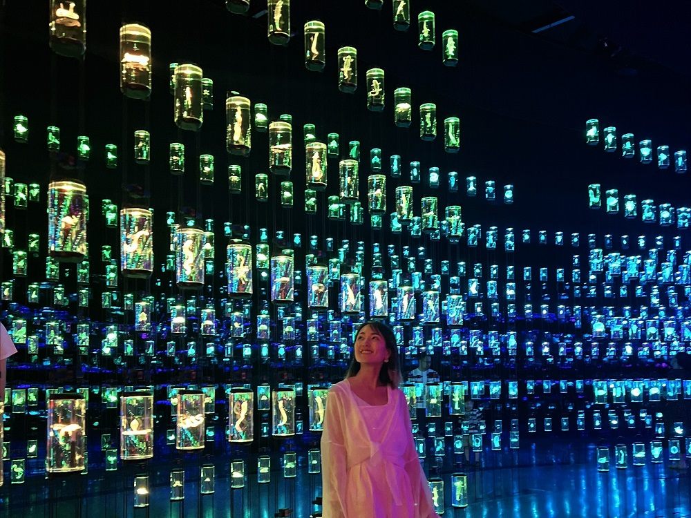 人気の施設なので事前予約必須ですが、ロビー階やカフェ、ショップは予約無しでも無料で入ることができるので、建築の外観や内観、最先端のロボット技術を見るだけでも楽しめますよ。また、夜には文字が浮かび上がるような幻想的なライトアップも必見です!
