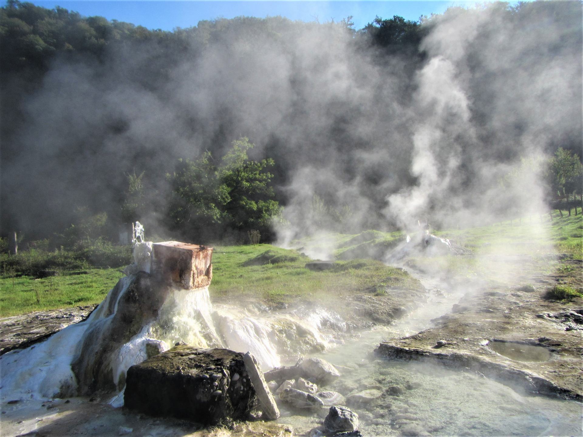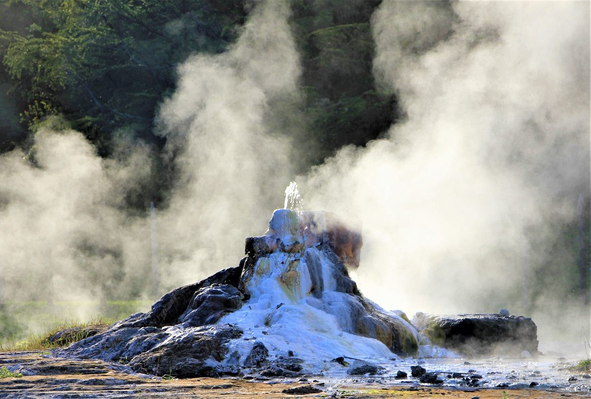 つづいて、逆光に照らされた噴泉塔の写真が気になったノカラケヴィに向かいます。かつての政治・文化の中心都市で、当時の遺跡も残っています。村の外れまで未舗装路を進むと、いきなり木立が開け、猛烈な蒸気が立ち込めていました。高さ1m強の噴泉塔がふたつ。勢いよく75℃の温泉を噴き上げています。逆光の中、立ち込める蒸気が噴泉塔の光背のように白く輝いています。ネットで見つけた幻想的な写真のままの光景に出合えたのは幸運でした。