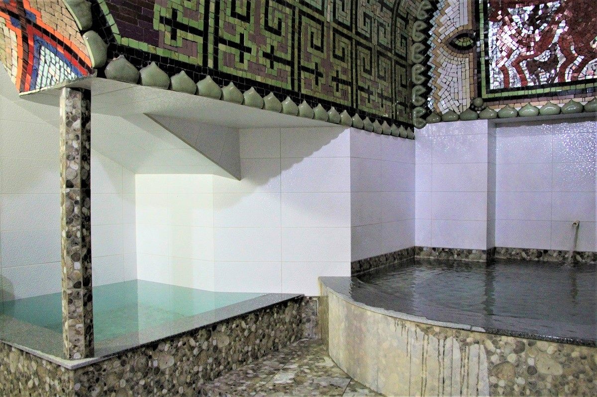 ロビーは天井が広く豪壮な雰囲気。水着着用の大浴場か裸で入浴できる個室を選択します。個室を選ぶと、係員が案内してくれました。改装された個室はきれいで、白いバスタブが置かれています。壁面に使われている縞模様が美しいグレーの石材は、日本で見たことがないものでした。