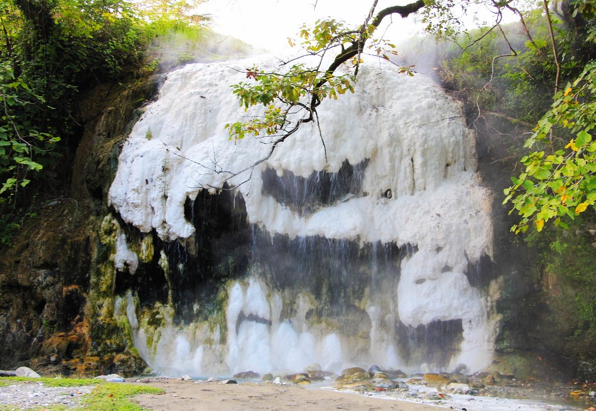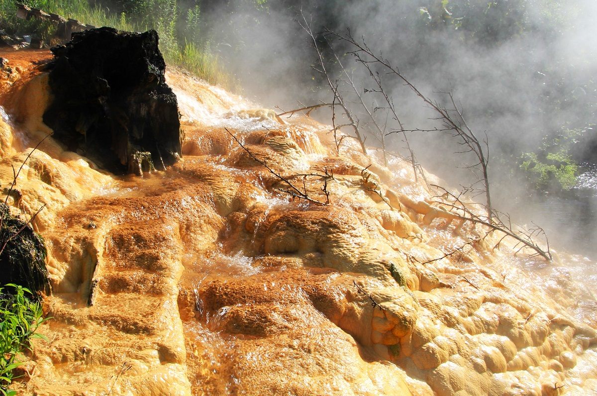 蒸気は刻々と姿を変えるため、飽きずに写真を撮り続けていると、地元の少年が手招きで下流側へと誘います。「何があるのだろう」と興味津々で河原に降りると、噴泉塔の湯が流れ落ちる場所に高さ5~6mの湯滝がありました。石灰華で覆われた白い滝は美しく、歓喜の声を上げて写真を撮ると、少年も嬉しそうに笑ってくれました。