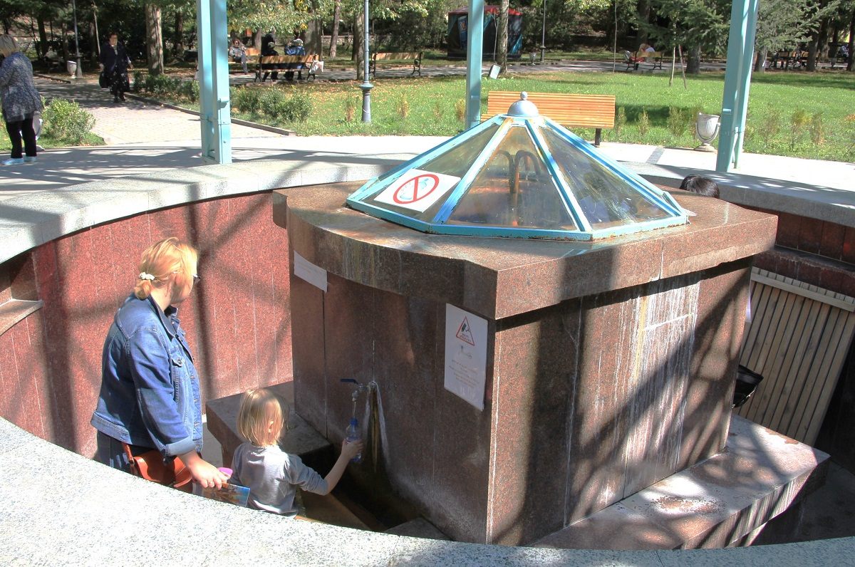 公園内を進むと、明るい緑色でお椀を伏せたような鉄骨建築が見えます。ここが飲泉場で、源泉は透明な六角形のガラス屋根の中に湧いています。蛇口は2ヵ所あり、飲んでみると苦みとエグ味が強く、決して飲みやすいとはいえません。チェコの「カルロヴィ・バリ」の温泉に似た泉質です。出荷しているミネラルウォーターは臭いを抜き、ガスを加えているとのことでした。