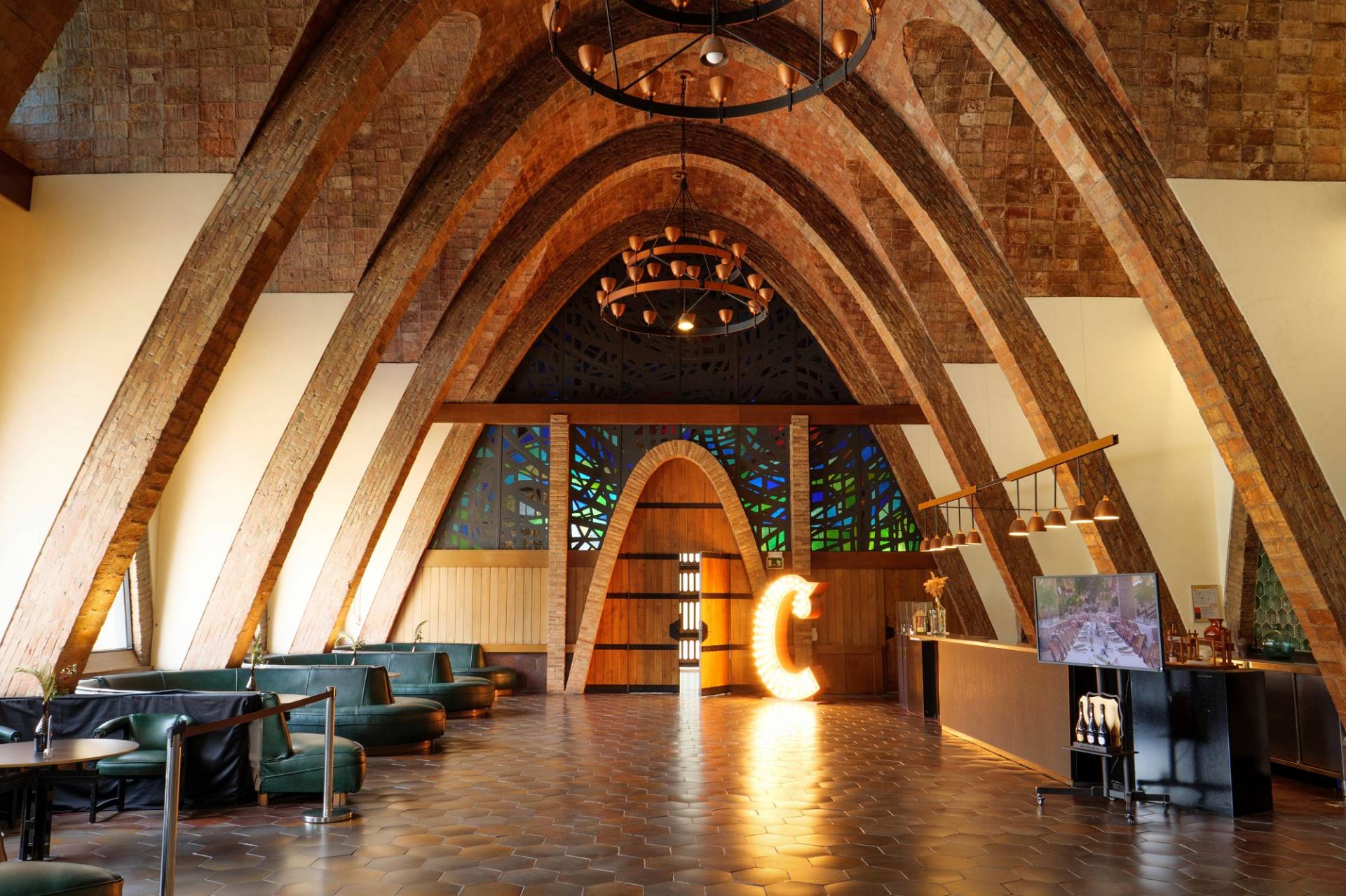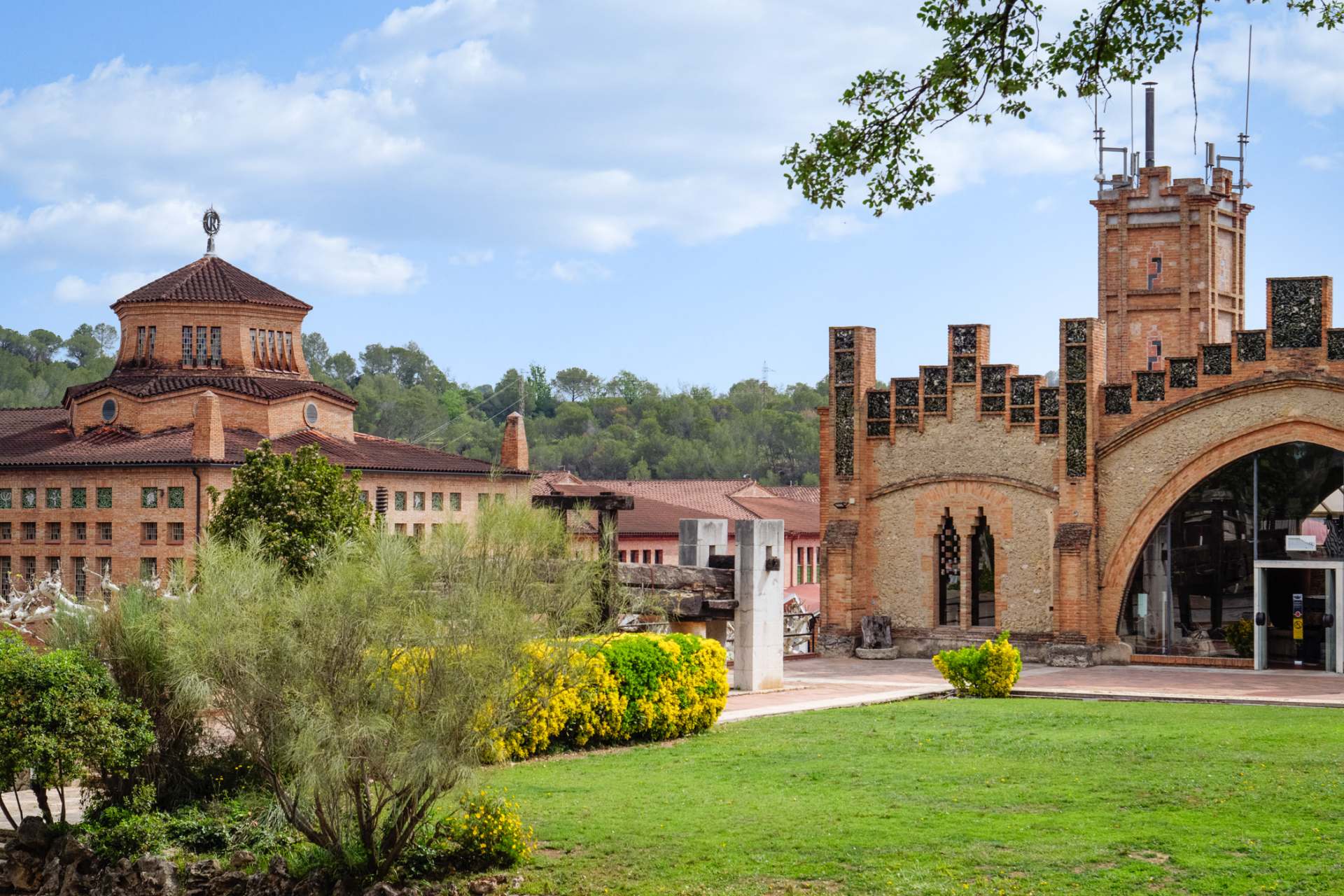 それでは、コドルニウのワイナリーを訪問してみましょう。ブドウ畑に囲まれた広い敷地内には、創業当時から残る建物のほか、モダニズムを代表する建築家のひとり、プッチ・イ・カダファルクによる建造物が点在しています。モダニズムとは、19世紀末から20世紀初頭にかけてカタルーニャで流行した建築スタイルのこと。見学ツアーの受付がある建物もそのひとつで、アーチの美しいエントランスホールが訪問者を迎え入れてくれます。