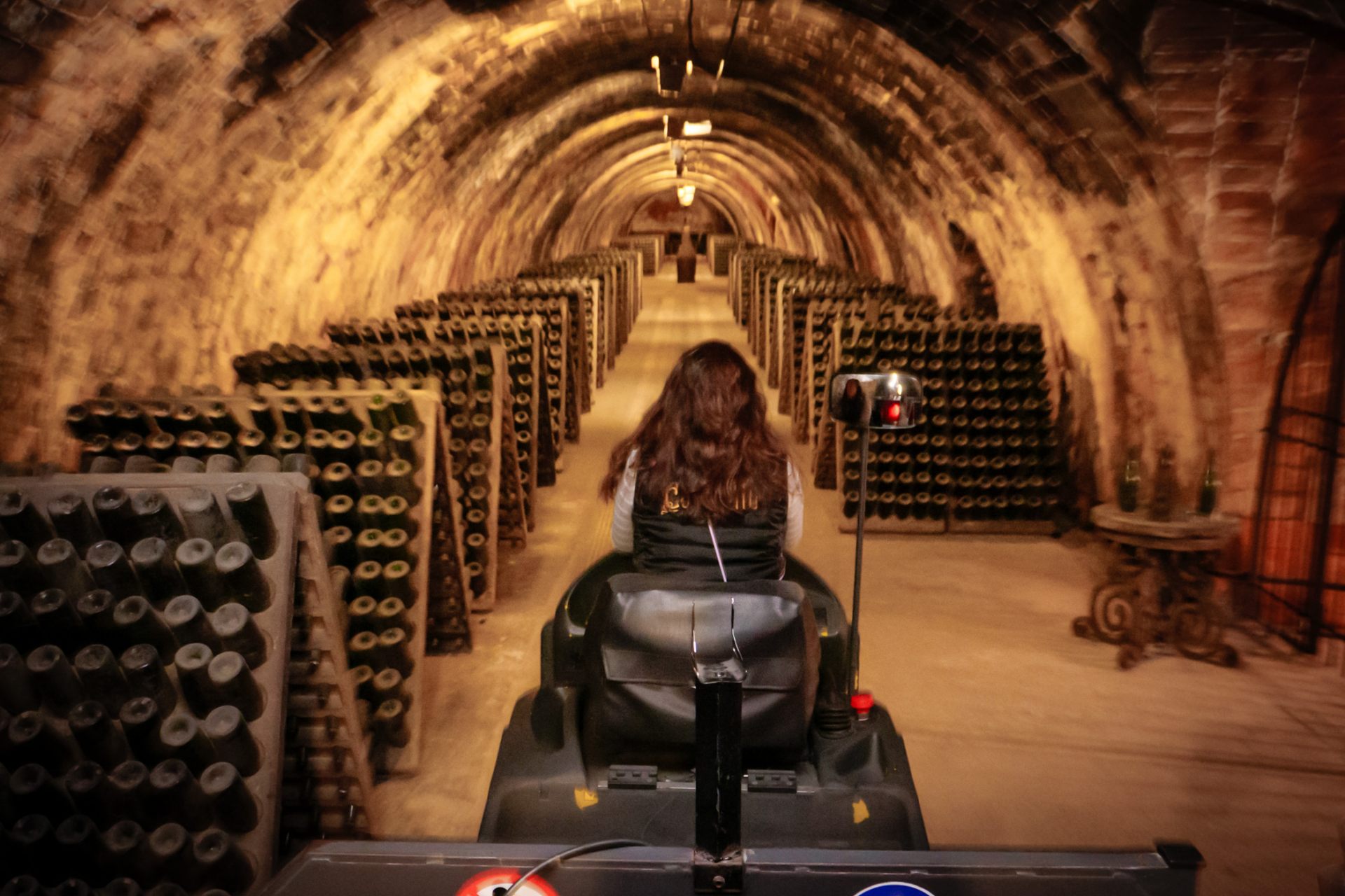 見学ツアーのハイライトは、トロッコ型バスに乗ってのセラー巡り。地中を網の目のように張り巡らされた貯蔵庫は全長30km以上あり、実際に走るのはそのごく一部ですが、狭いトンネル内を疾走するのは迫力満点です!