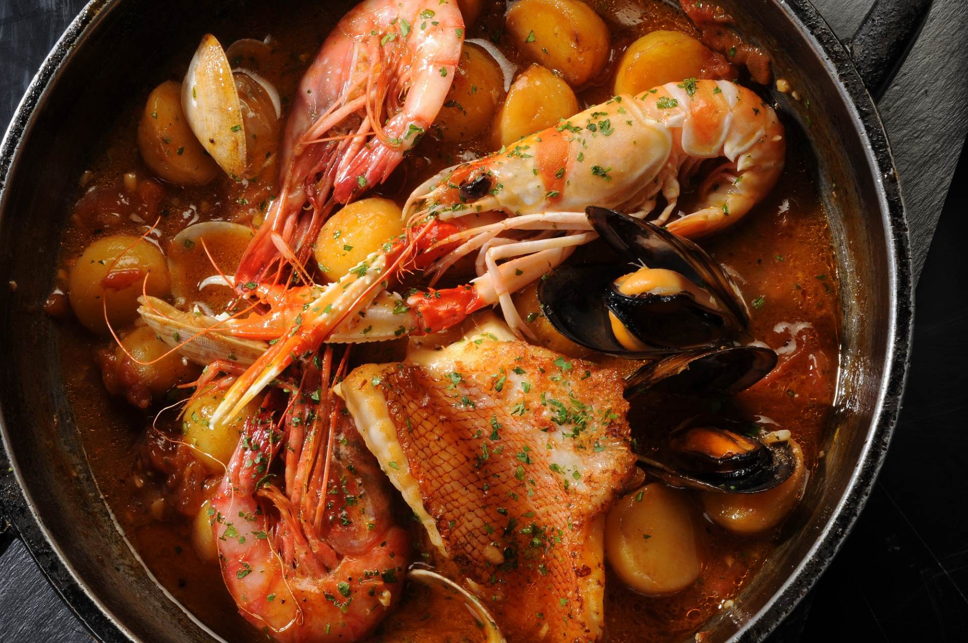 スケ・デ・ペイシュ(Suquet de peix)は、地中海の海の幸をふんだんに入れて煮込んだ濃厚なスープ。もともとは漁師たちが市場で売れない傷ついた魚を調理したもので、さまざまな種類の魚のほか、エビや貝を入れるなど、漁師の数だけバリエーションがあるといわれます。